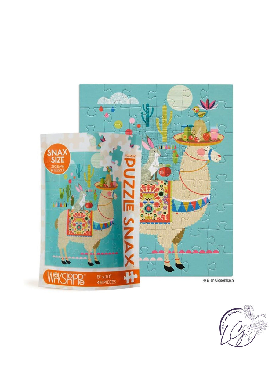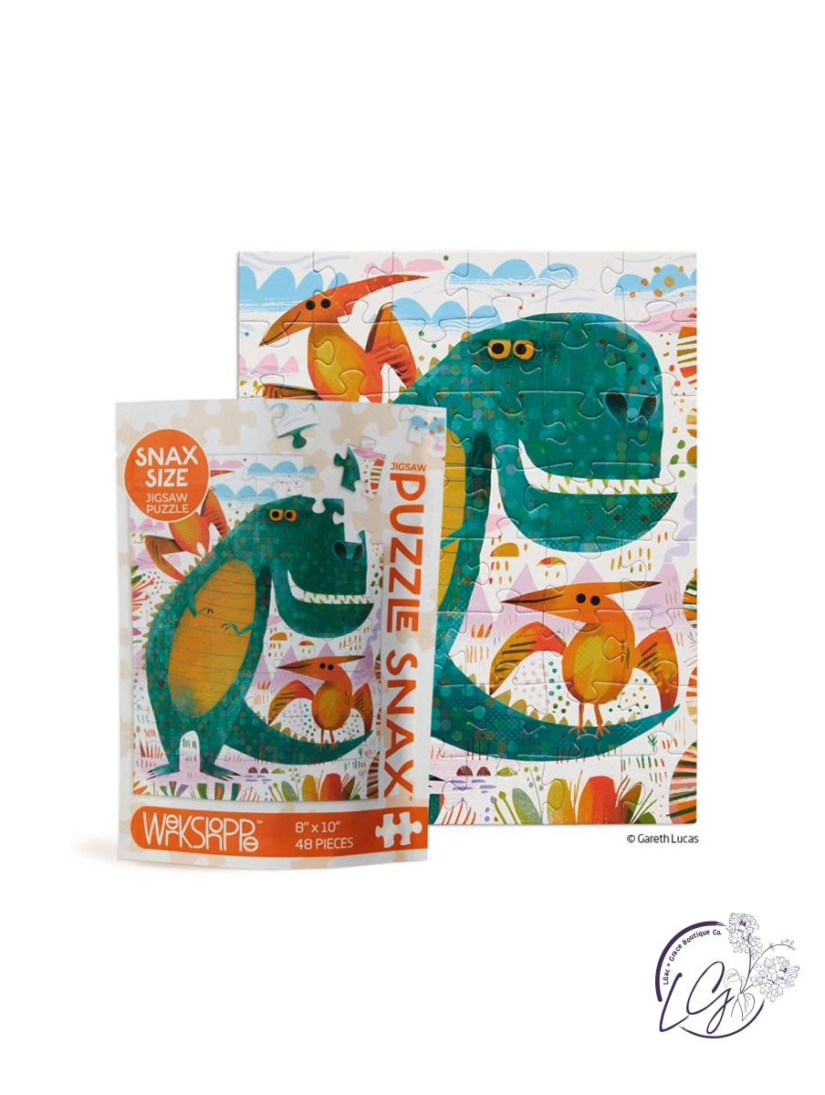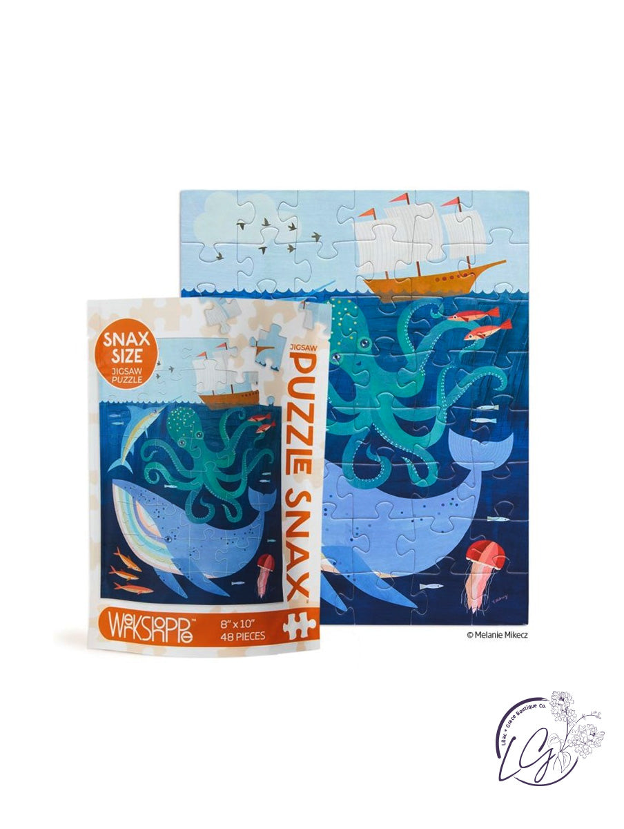 This 48 piece, ribbon cut jigsaw puzzle is 8" W x 10" H when assembled. Made in the U.S.A. with ESKA 100% recycled board & non-toxic vegetable-based ink.