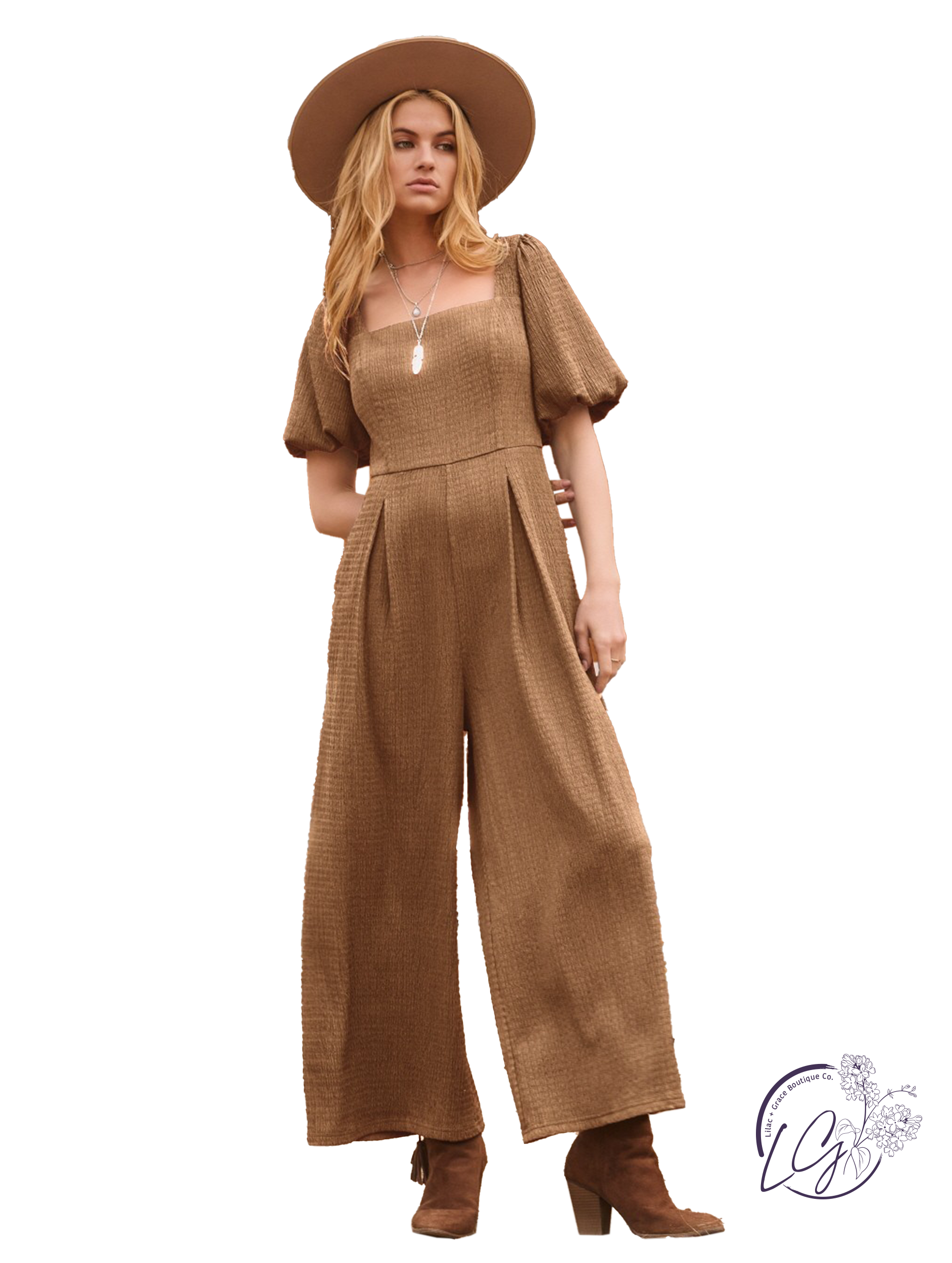 Conquer your next adventure in the Among The Hills Jumpsuit! With a solid textured design, square neckline, and puff sleeves, this jumpsuit will have you standing out in any crowd. The back smocked bodice ensures a perfect fit, allowing you to move with confidence and take on any challenge that comes your way.