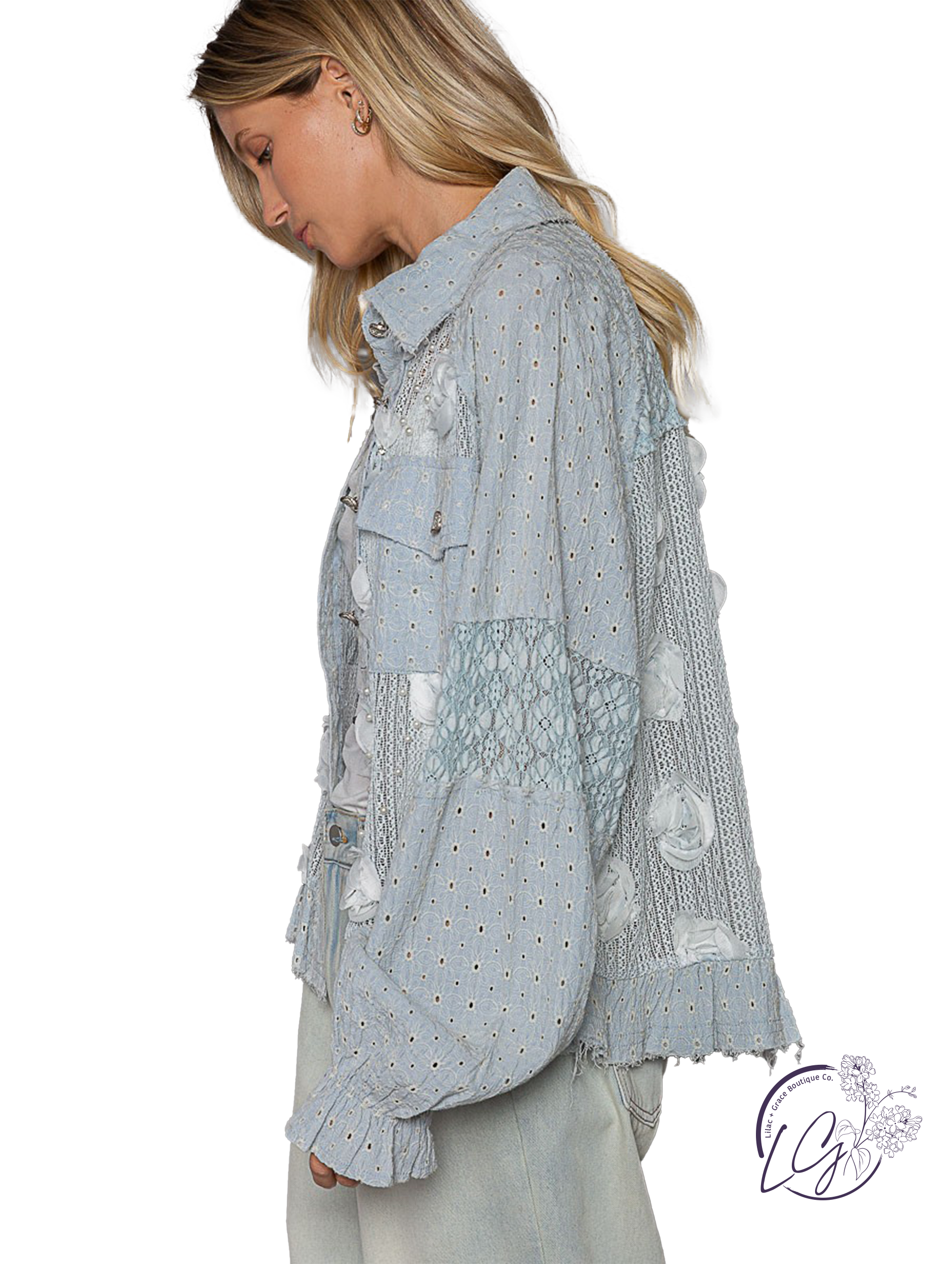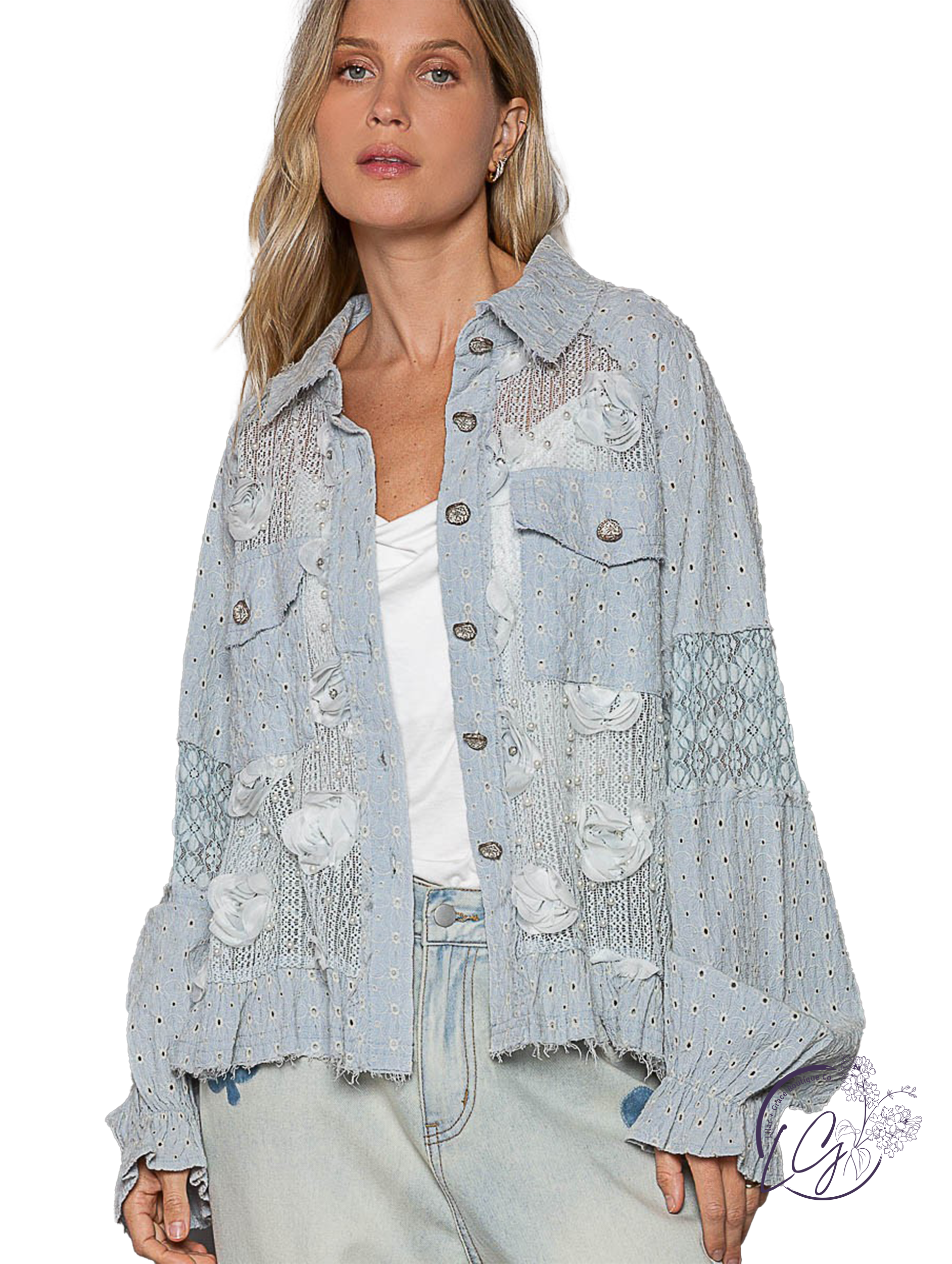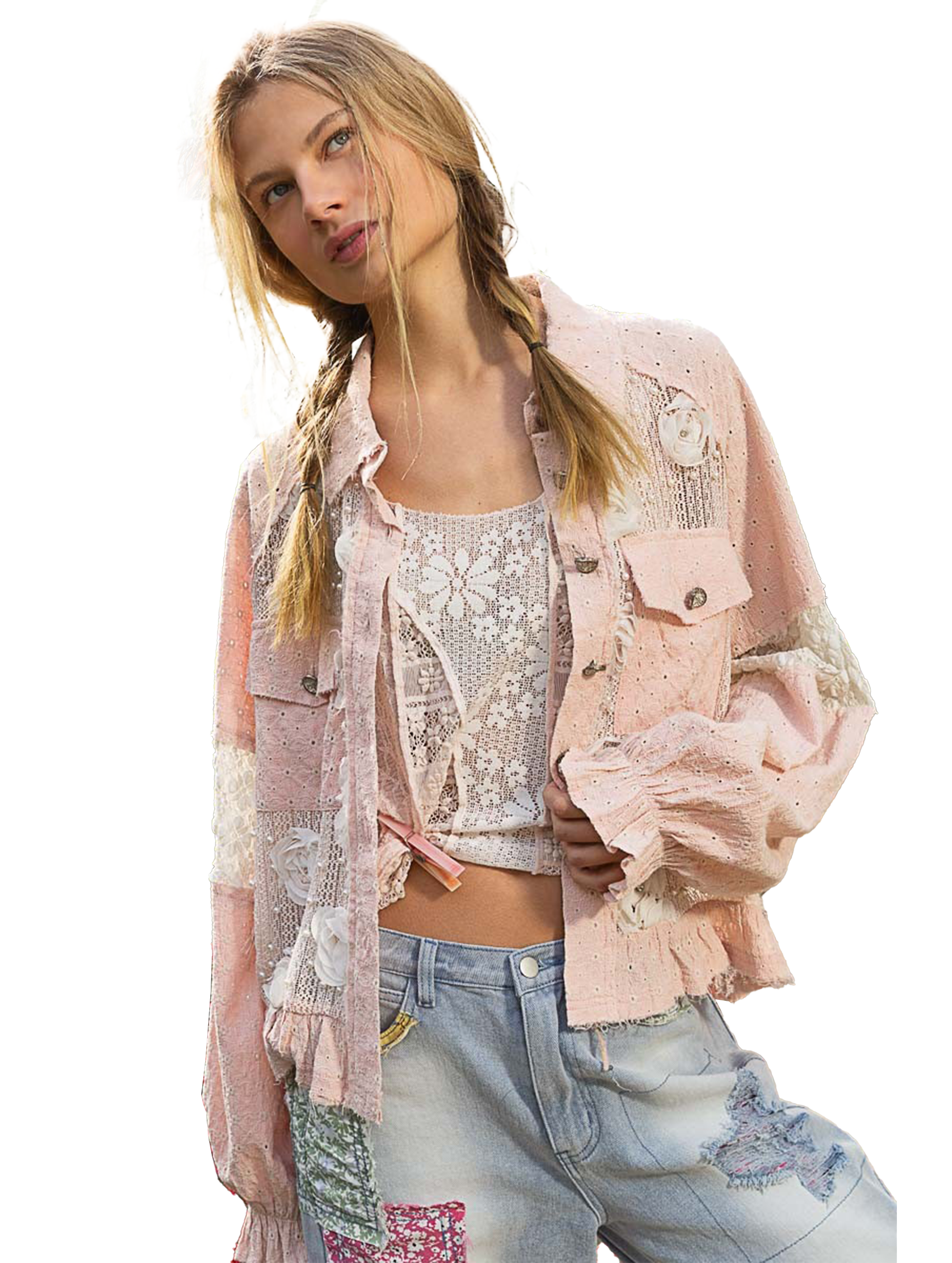 Elevate your style with our Art And Streets Button Down Top! This regular fit jacket top features beautiful balloon sleeves and a textured woven design with lace fabric patches. The shirred elastic bands at the wrists and unique raw edge detailing add a touch of elegance. Keep your essentials close with the convenient front pockets.