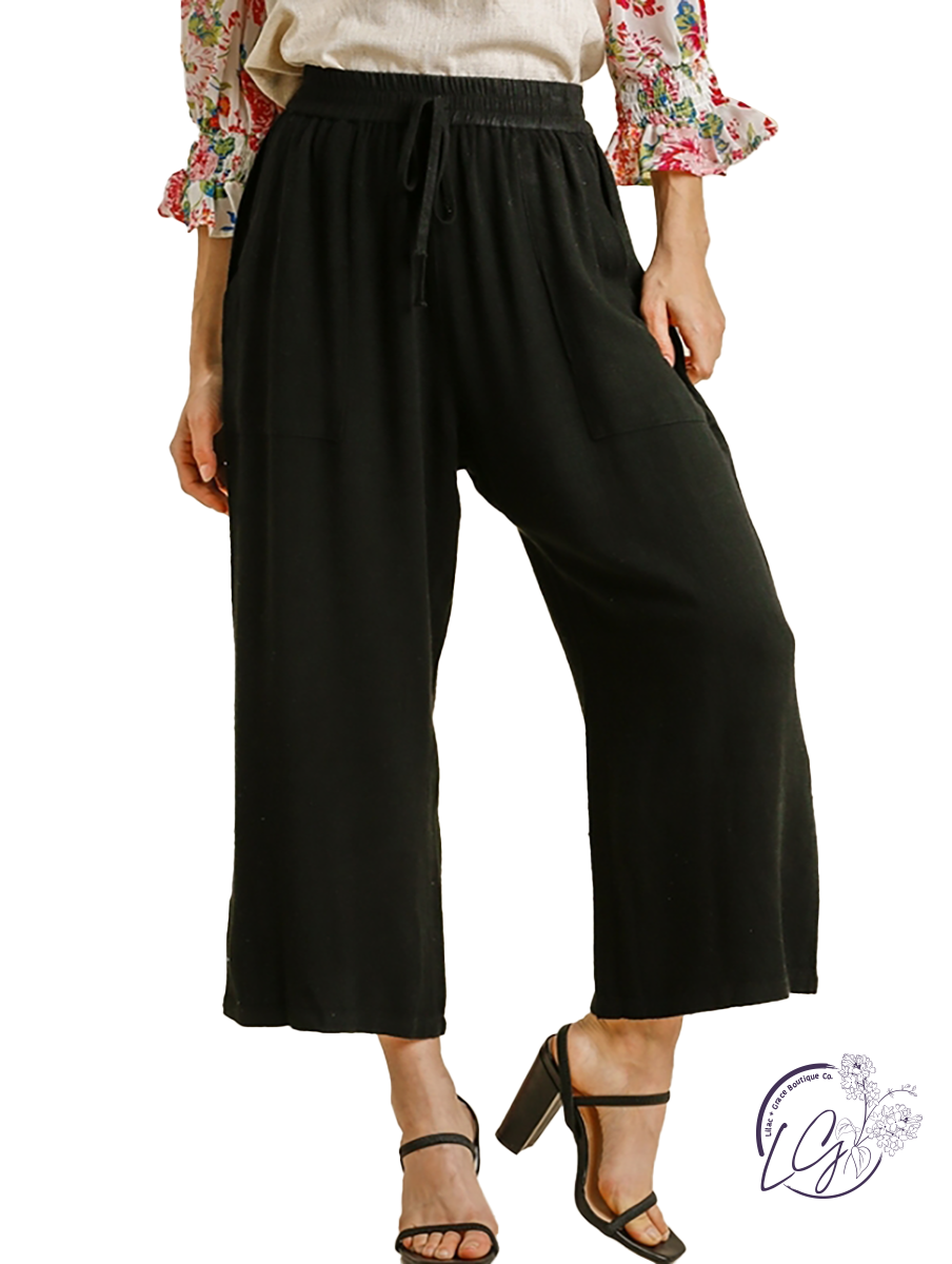Linen Blend Elastic Waistband and Drawstring Wide Leg Jogger Pants with Pockets The perfect blend of style and comfort. These pants are a great addition to any wardrobe and will have you feeling like you're walking on sunshine with their elastic waistband and drawstring feature. Plus, pockets for all your must-have items!