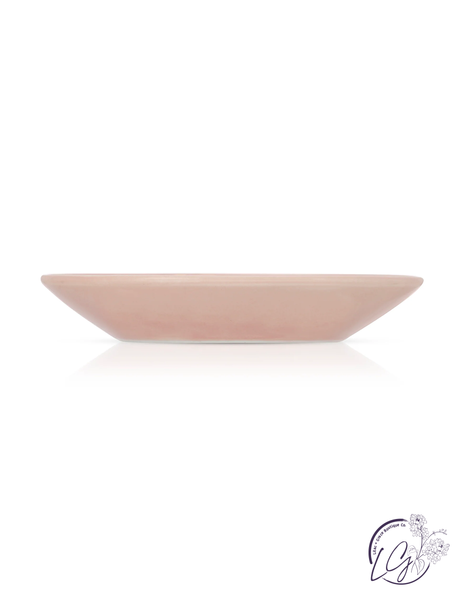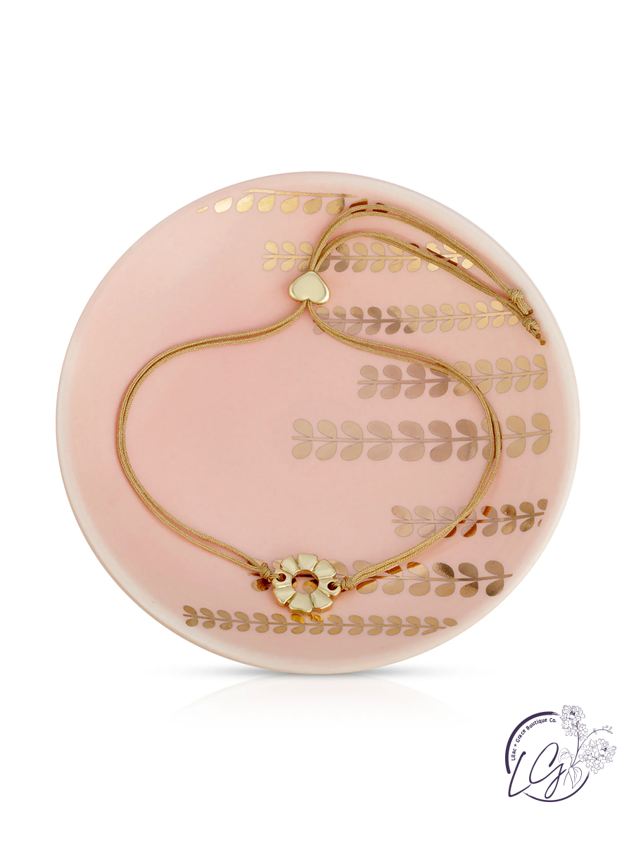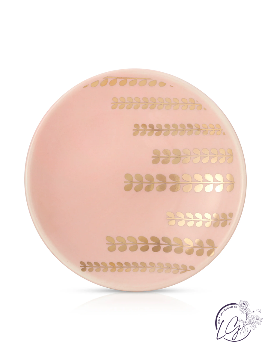 Perfectly paired bracelet and jewelry dish set makes a great gift for mom! She'll be thrilled to receive this light pink dish featuring gold flower accents, reminding her that she is beautiful and amazing.
