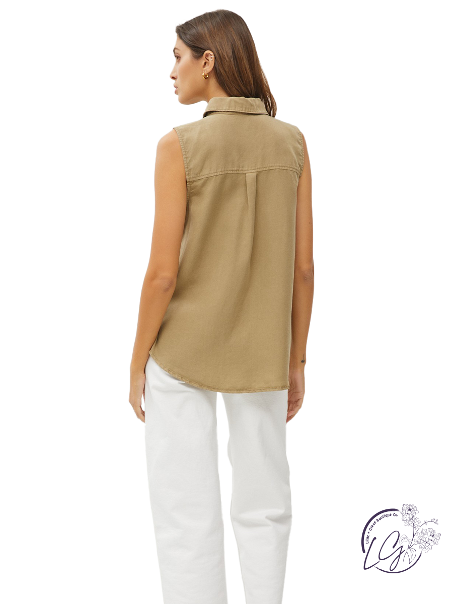 The Breezy Days Button-Down Top exudes effortless style and comfort, perfect for warm weather outings. Crafted from lightweight Tencel fabric, this sleeveless shirt offers a breathable and airy feel, ideal for staying cool on sunny days. The button-down front adds a classic touch and allows for easy wear and styling. With its relaxed silhouette and sleeveless design, this top captures a laid-back vibe while still maintaining a polished look. Whether paired with shorts for a casual day out or layered under a blazer for a more refined ensemble, the Breezy Days Button-Down Top is a versatile and stylish addition to any wardrobe.