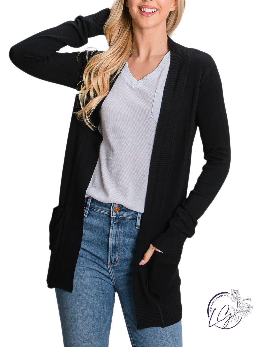 Casual open cardigan featuring cotton blend knitting sweater with front pocket featuring , ribbed cuffs and hem. The soft knit cardigan is prefect for a breezy layering.