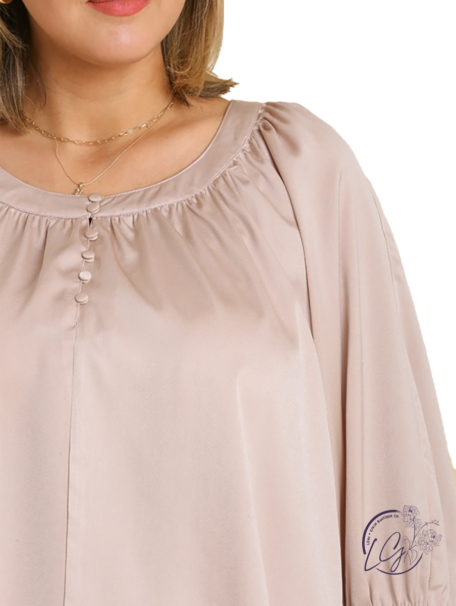 Washed Satin Round Neck Button Front Top with Smocked Cuff Detail