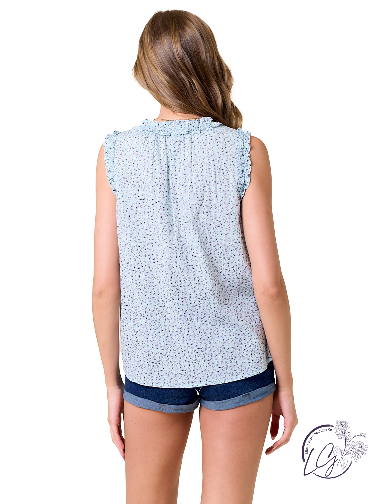 Bring carefree femininity to your wardrobe with this sleeveless top featuring a delicate ditzy print. Crafted from soft cotton, it showcases a charming split V-neckline adorned with gentle ruffles, complemented by ruffled armholes for added flair. The relaxed, flowy fit makes it perfect for everyday wear, effortlessly pairing with your favorite denim or shorts. Dress it up with accessories for a refined daytime look, or keep it casual for laid-back weekend outings.