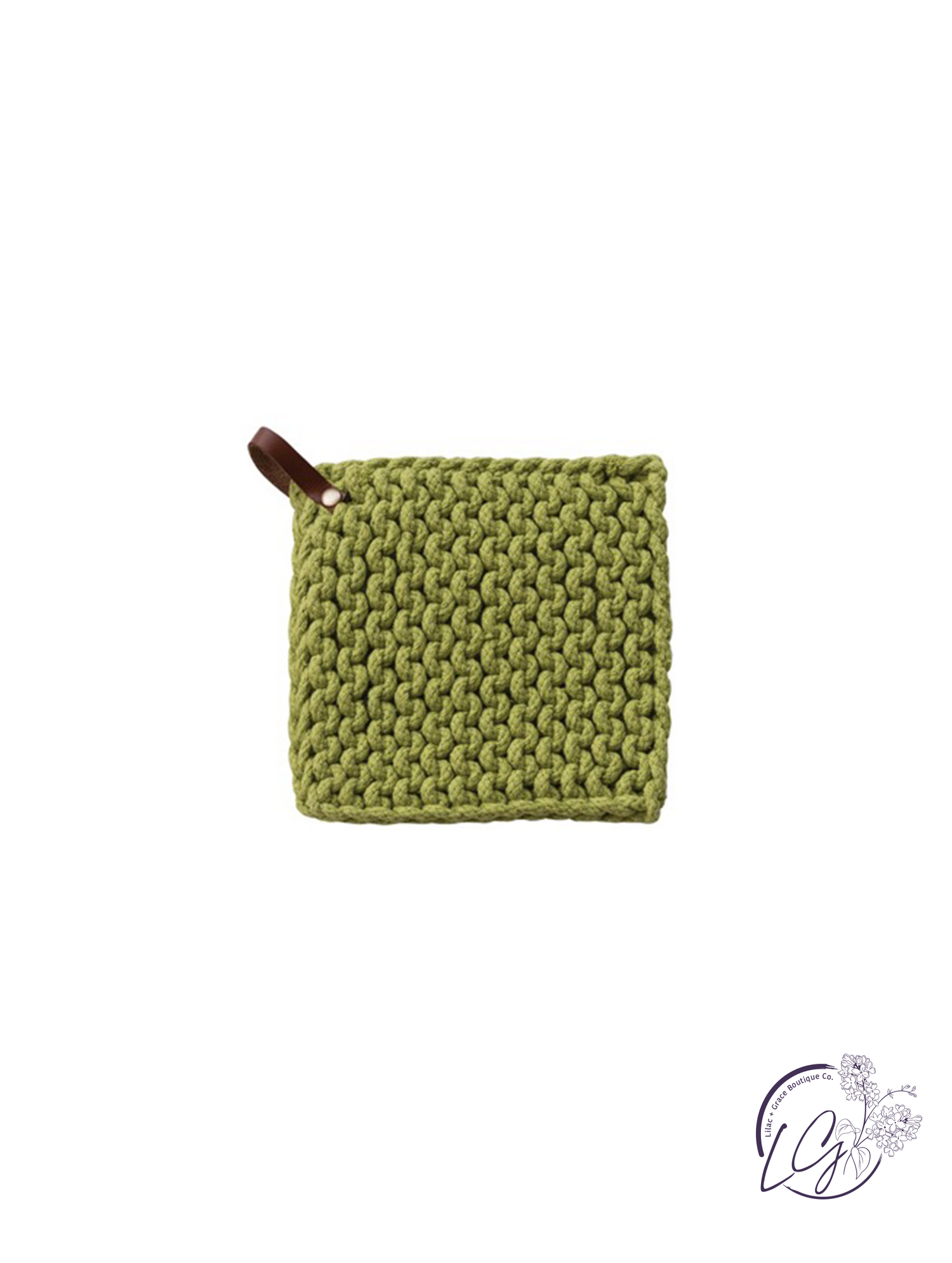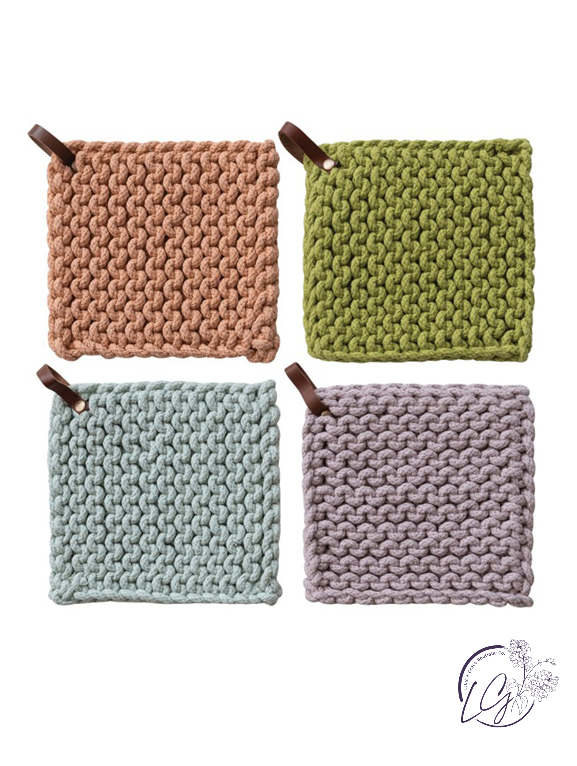 Add a touch of rustic charm to your kitchen with these 8" square cotton crocheted pot holders. Each pot holder features a leather loop for easy hanging and comes in your choice of four colors. These durable pot holders are perfect for protecting your hands and surfaces from hot pots and pans. Handmade with care, they make a great addition to any kitchen decor. Choose from classic white, elegant black, vibrant red, or calming blue to match your style. Make cooking and baking more enjoyable with these stylish and functional pot holders that add a cozy and inviting feel to your kitchen space.