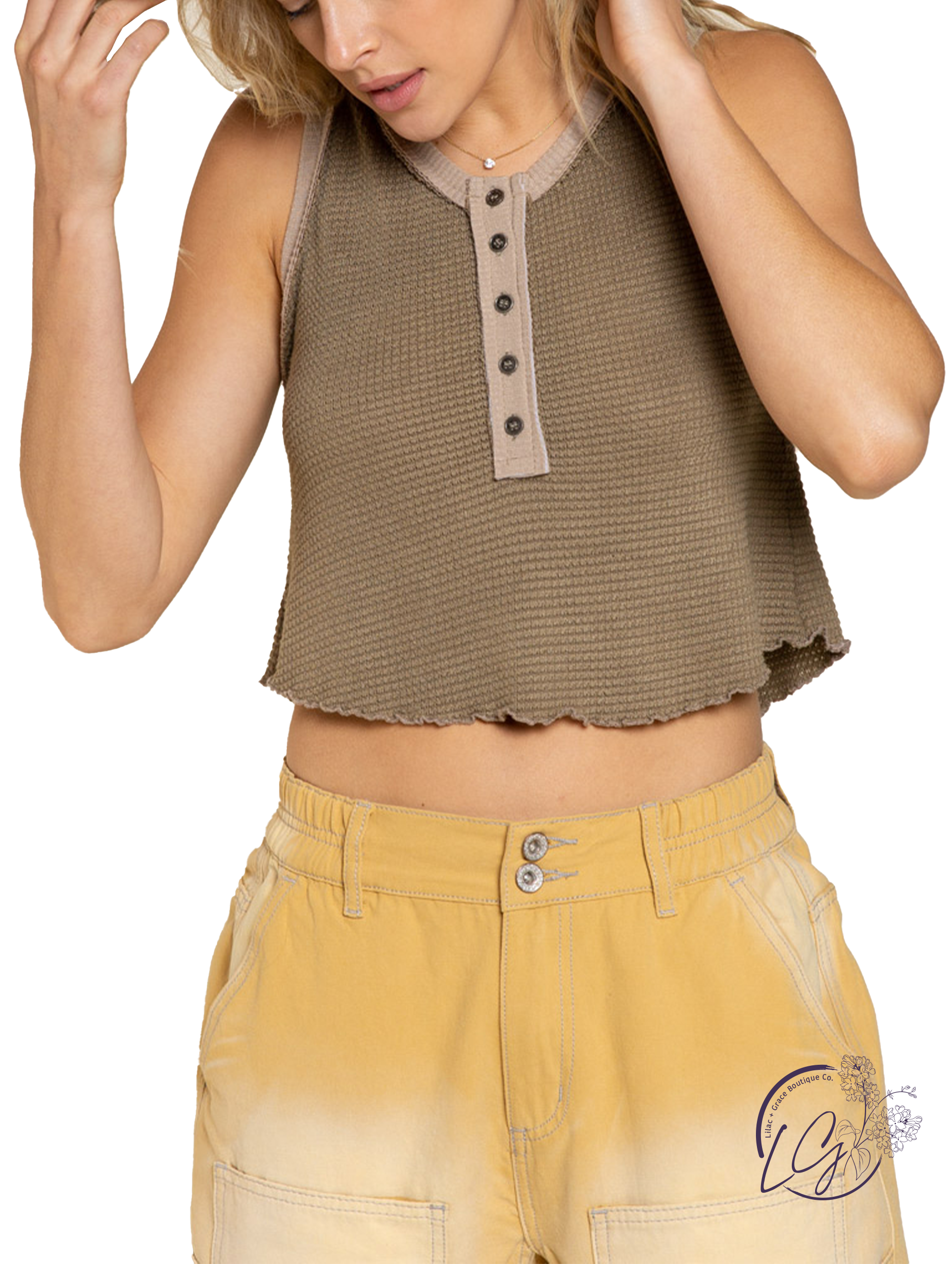 A Breeze Blush Tank features a textured waffle knit fabric that adds depth and visual interest to the garment. With its shorter length, it typically hits above the waist, offering a trendy and modern silhouette. The waffle texture provides a cozy and comfortable feel against the skin, making it perfect for casual wear. This tank has a relaxed fit, allowing for easy movement and versatility in styling.