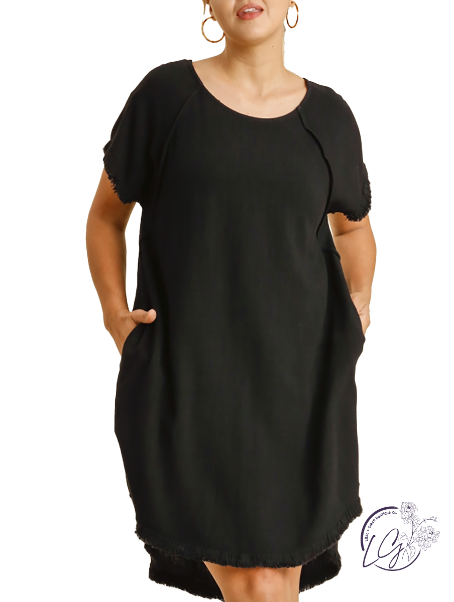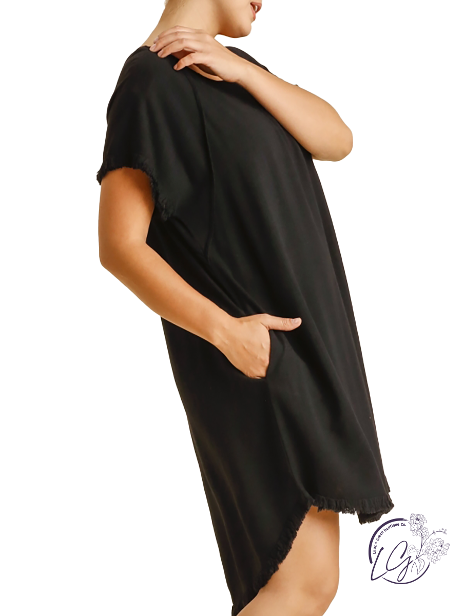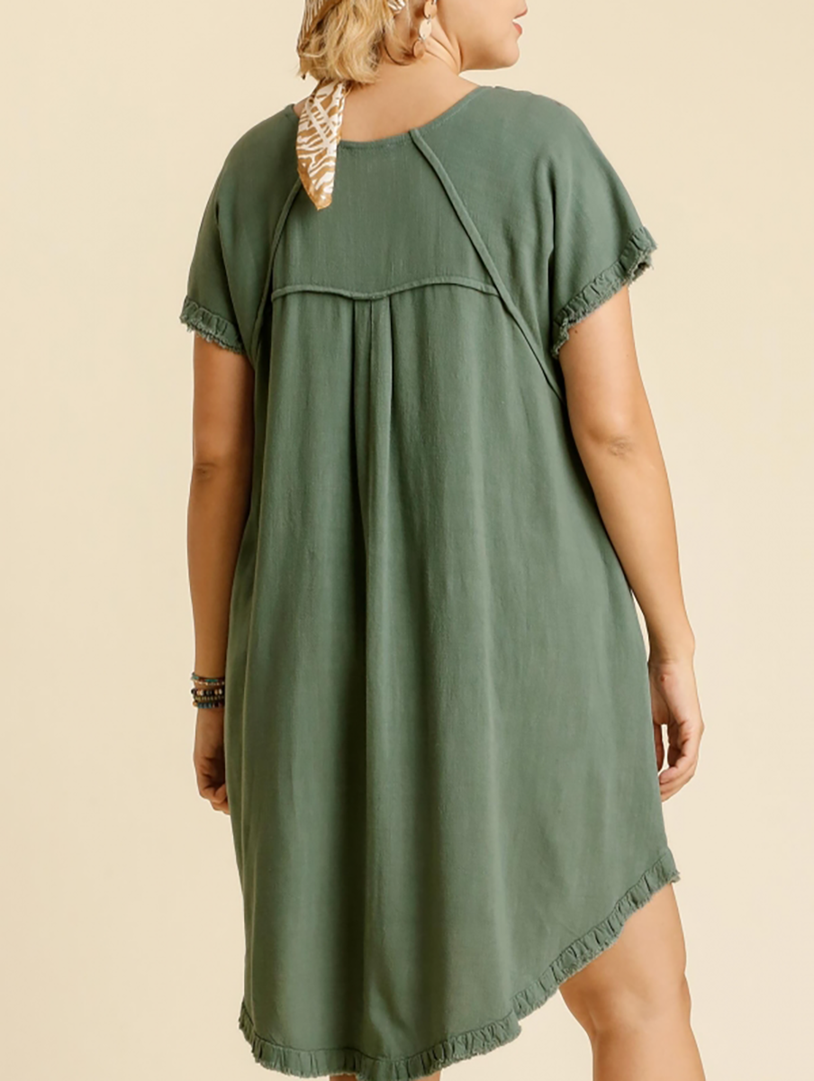 Linen Blend Round Neck Pocket Dress with Fringe Short Sleeves and a High Low Scoop Hem
