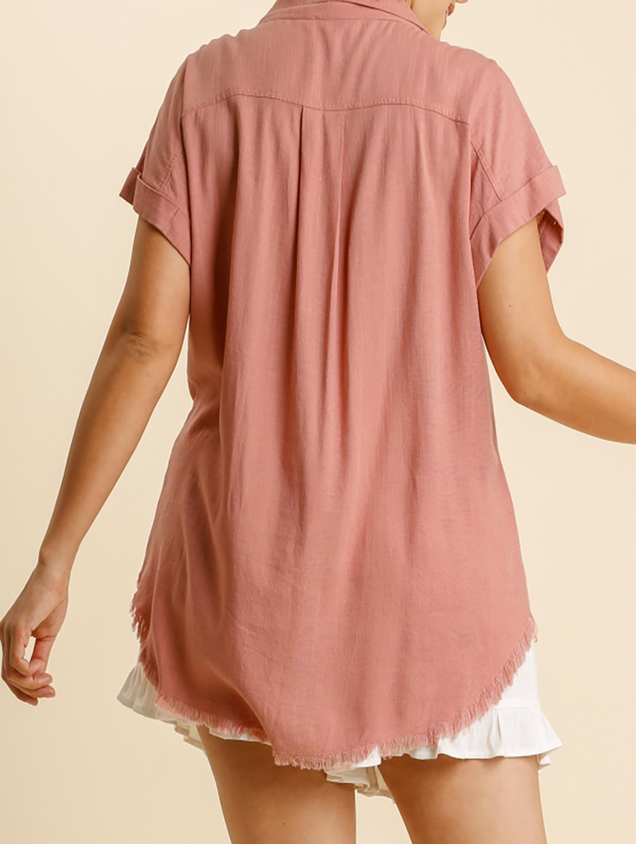 Linen Blend Collar Button Down Short Folded Sleeve Top with Chest Pocket and Frayed Edged Hi-Lo Hem