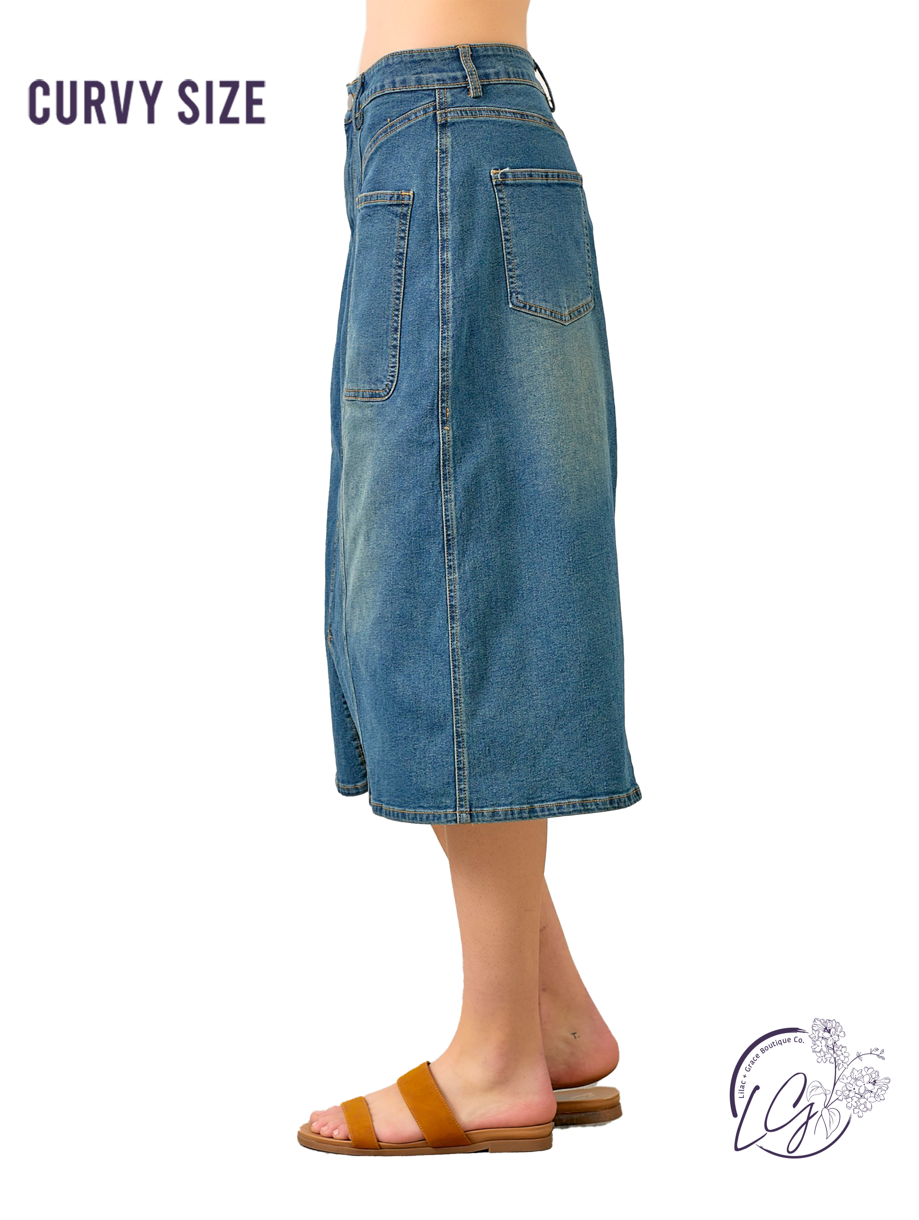 This denim maxi pencil skirt features a sleek silhouette with a front slit detail for added movement and edge. Designed with classic pockets and clean seam lines, it blends structure with everyday function. Pair it with a tucked-in tee or a crisp blouse for an easy, styled look.