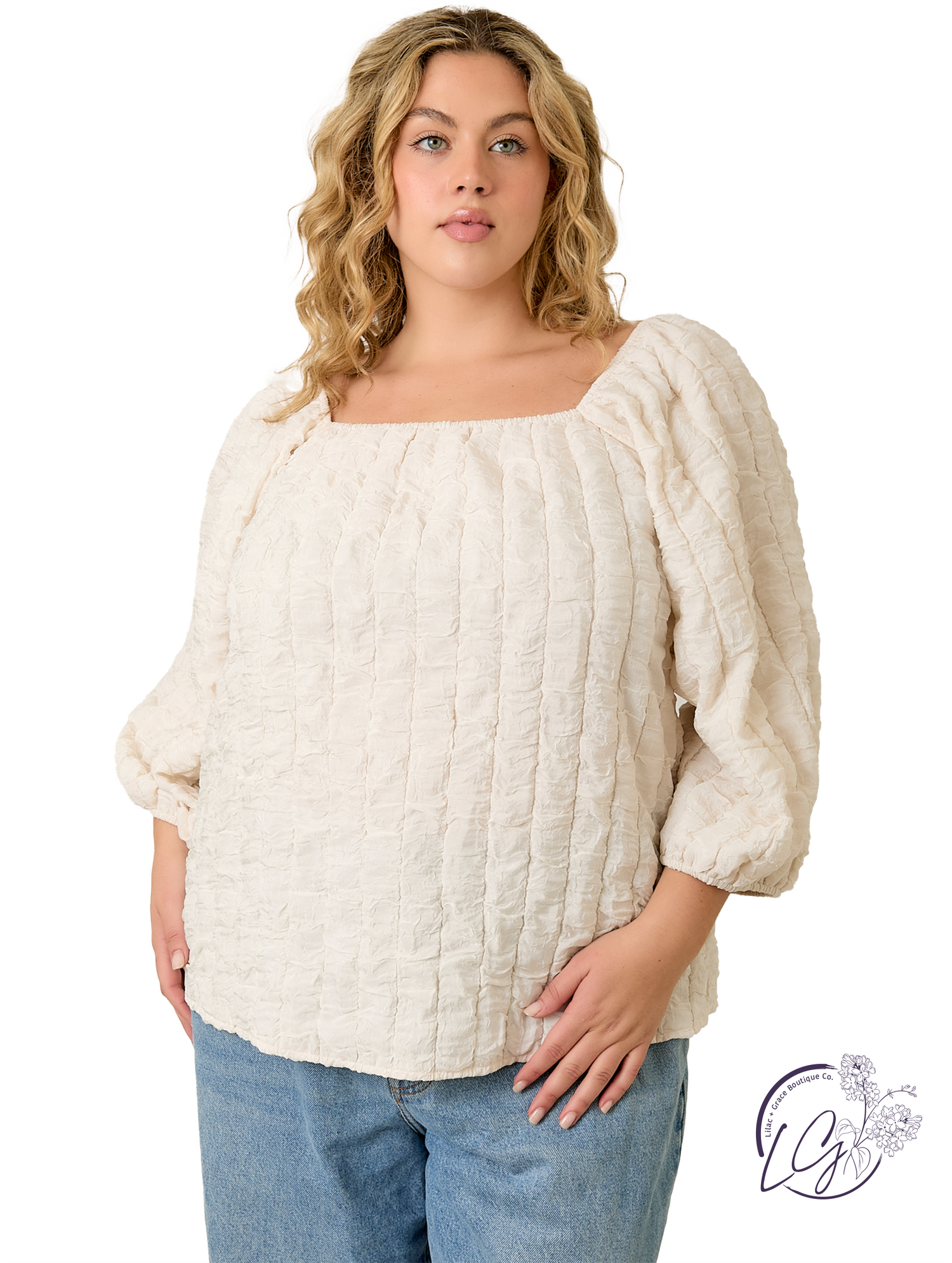 Add subtle dimension to your look with this 3D textured blouse, designed with a clean square neckline and elegant long sleeves. The textured fabric brings visual interest and a soft structure, while the tailored fit offers a polished silhouette. Perfect for both work and weekend plans, it pairs effortlessly with high-rise trousers or denim for a refined finish.