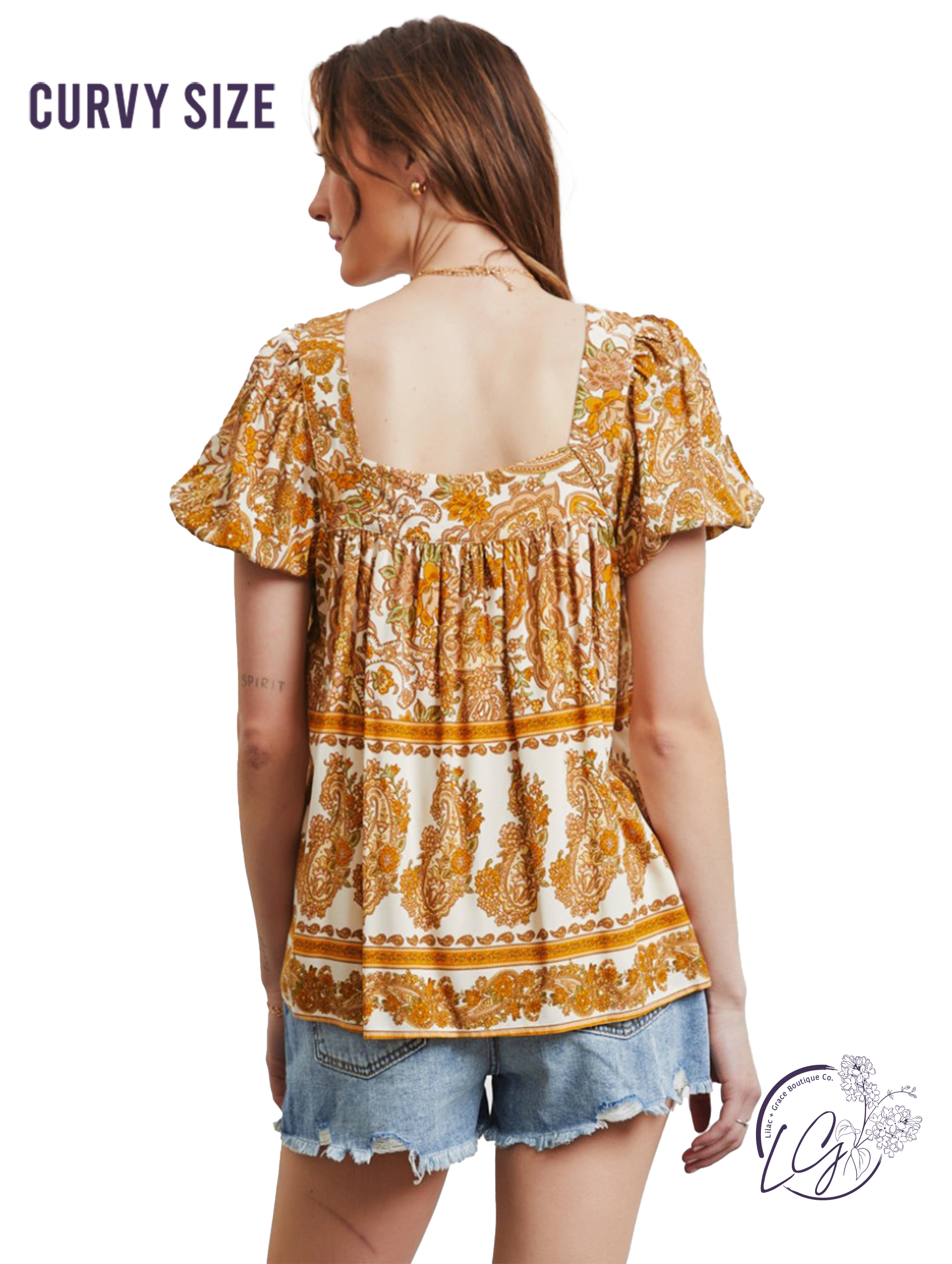In style with our Chic Border Blouse! Featuring a classic paisley border print on a square neck design, this blouse exudes timeless elegance. The flattering puff sleeves add a touch of femininity, making it perfect for any occasion. Make a statement with this must-have piece today!