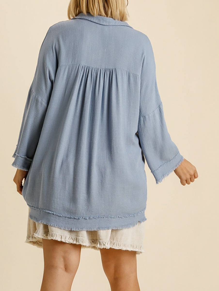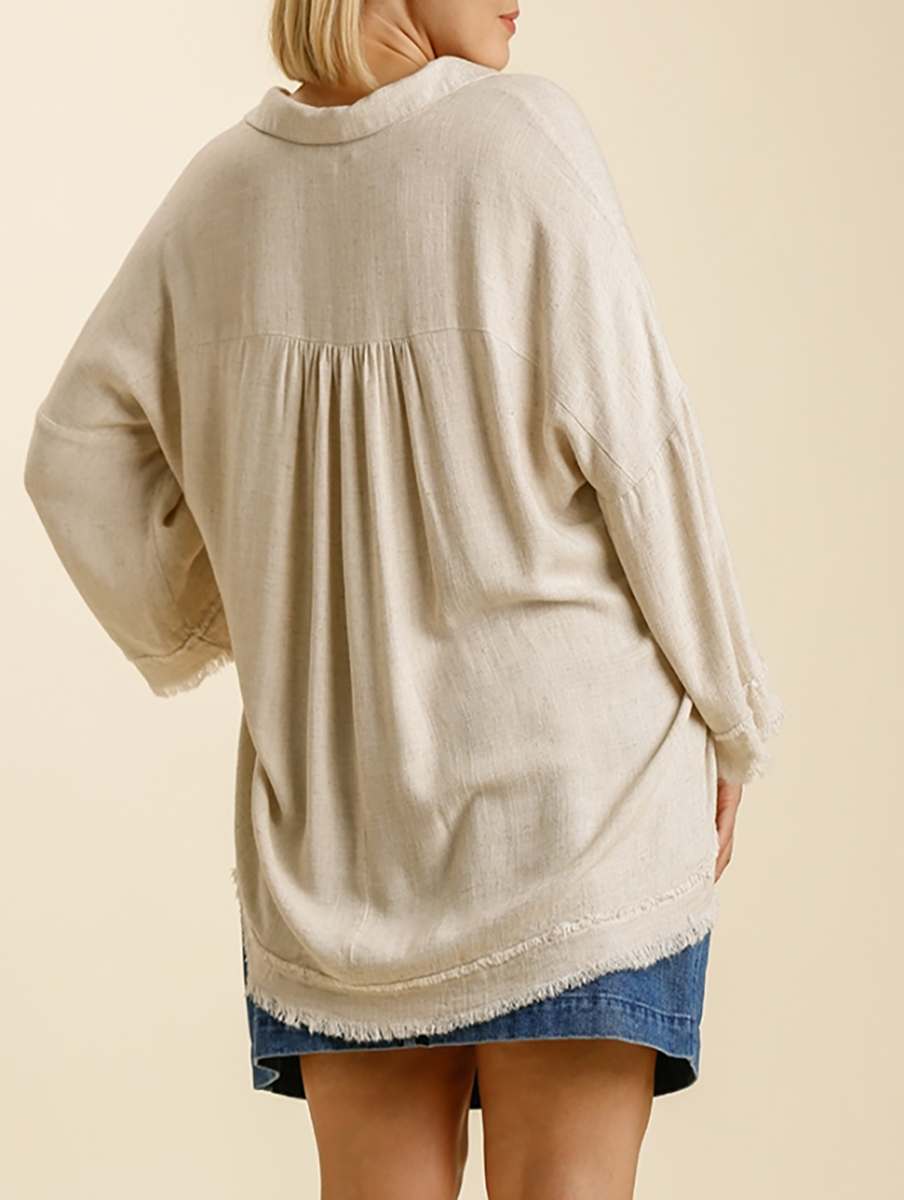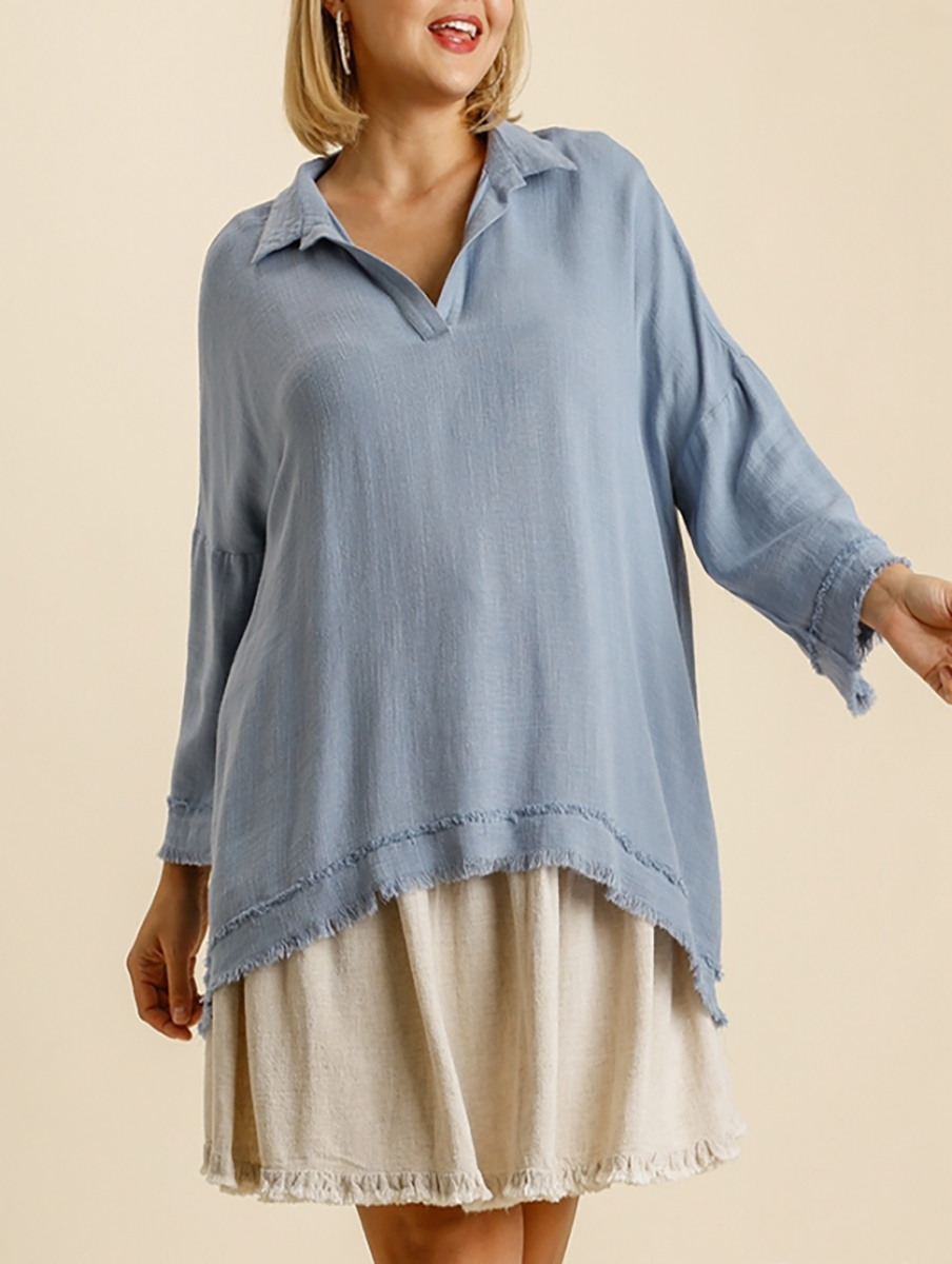 Linen Blend Collared 3/4 Sleeve Top with High Low Frayed Hem