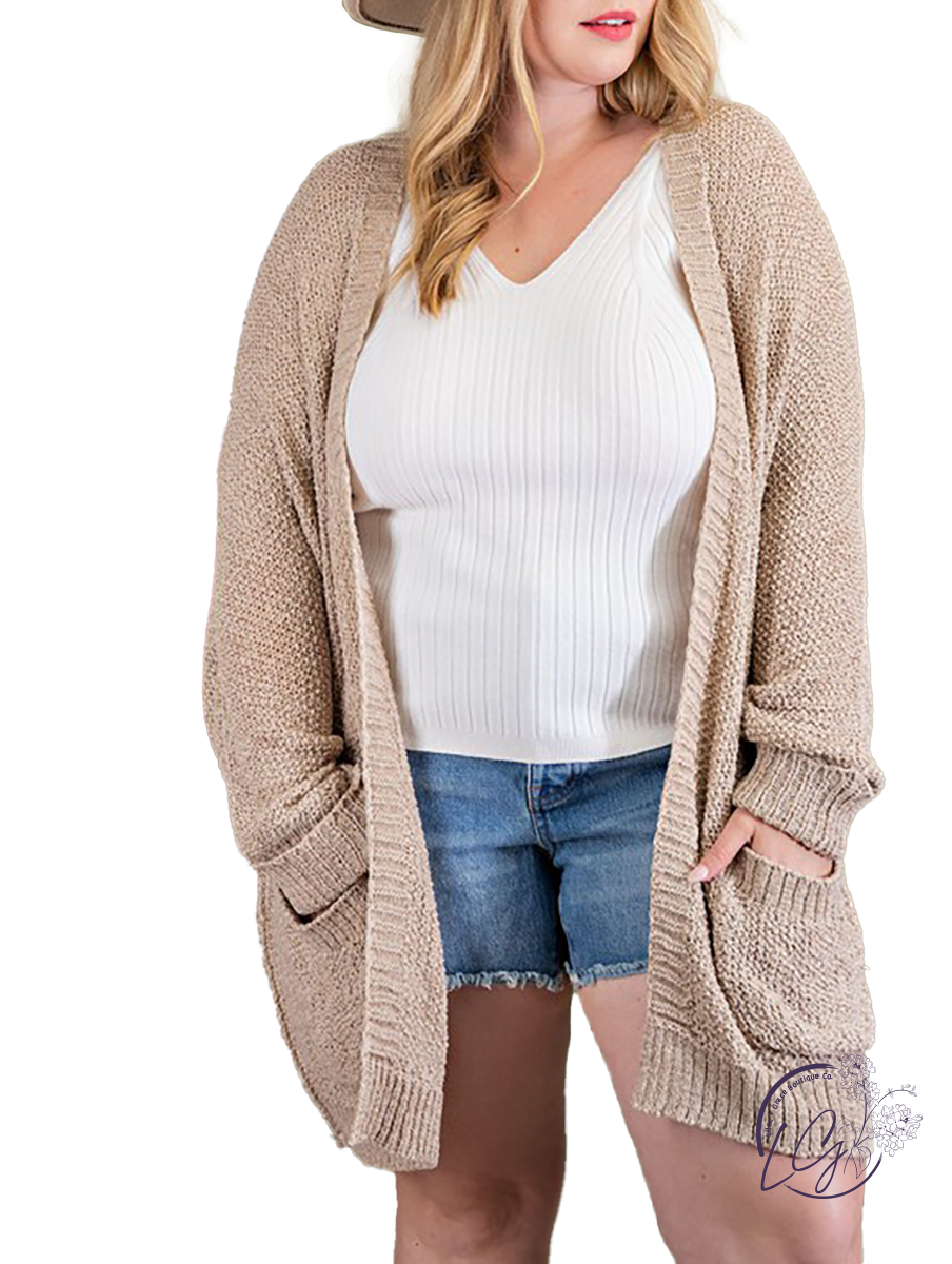 Plus knit cardigan made with an open front look with front pockets.
