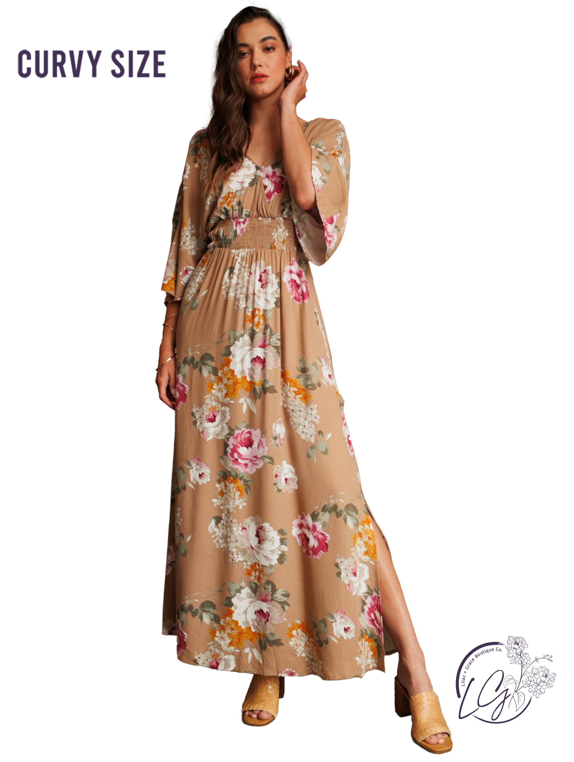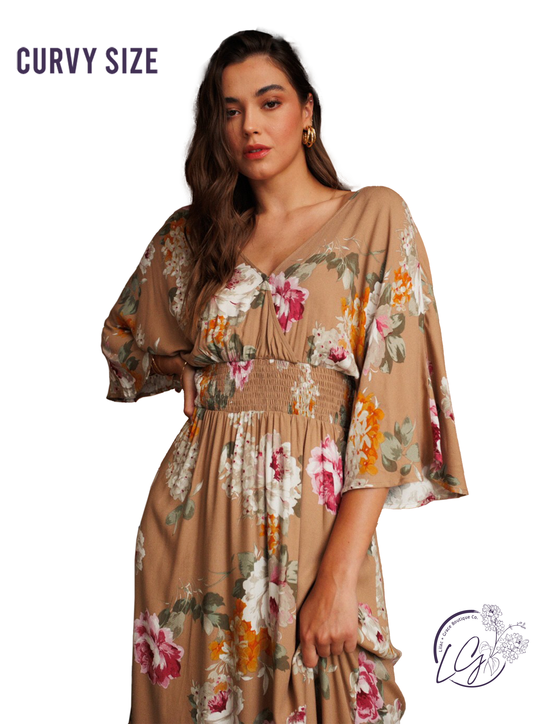 Rise to the challenge in our Curvy Fragrant Winds Blow Dress! This bold maxi dress features a vibrant floral print, smocked waist for a flattering fit, and 3/4 kimono sleeves. Take a risk and turn heads with the open back and tie closure, while staying comfortable with the side slits.