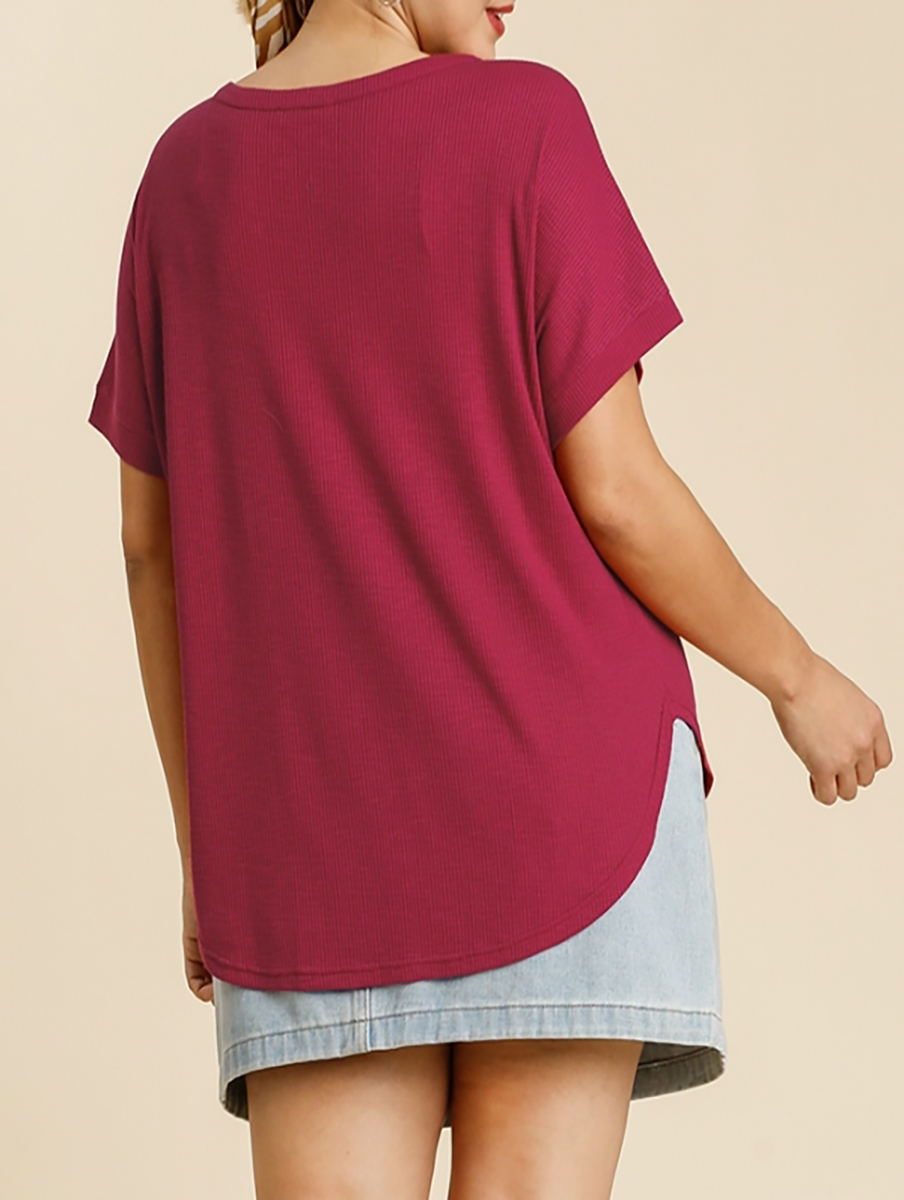 Curvy Button Front Round Neck Short Sleeve Ribbed Top with Round Hem