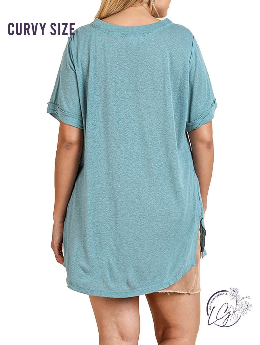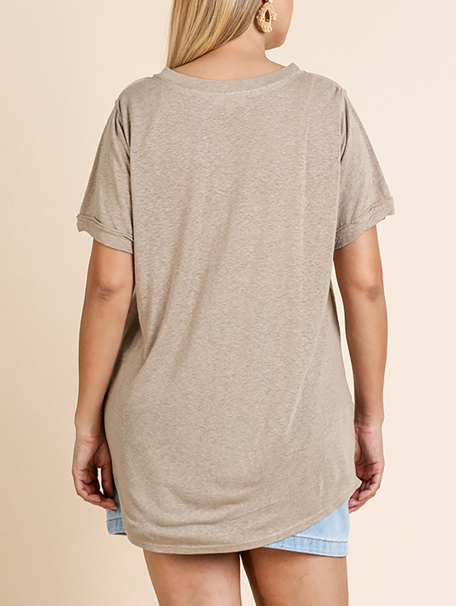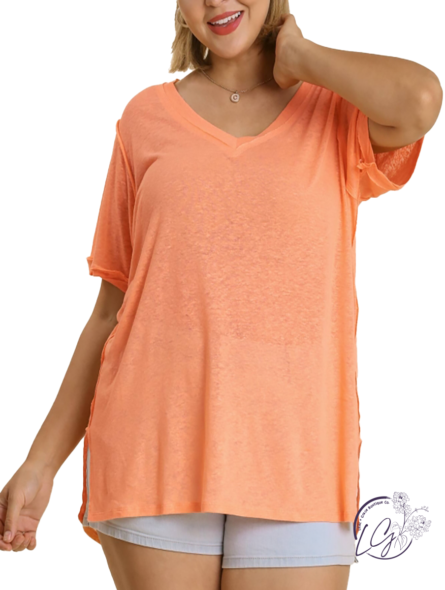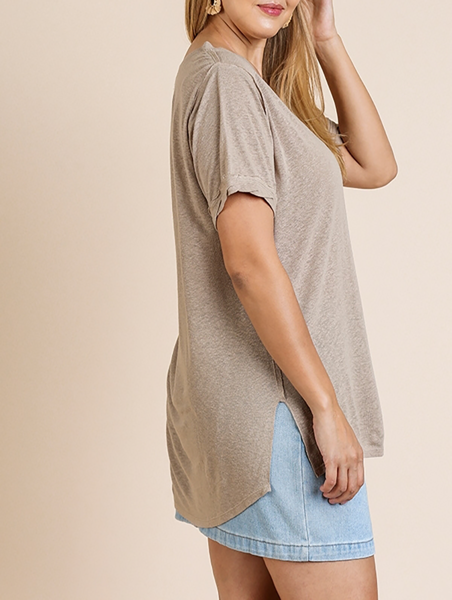 Linen Blend Short Gathered Sleeve Slub Knit V-Neck Top with Side Slits