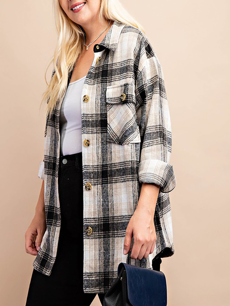 The key feature of the "Curvy Just What I Need Shacket" is its hybrid design. It is crafted from a sturdy yet soft fabric that falls somewhere between a shirt and a lightweight jacket. This unique fabric choice offers just the right amount of warmth and comfort, making it ideal for transitioning between seasons or for layering over various outfits.