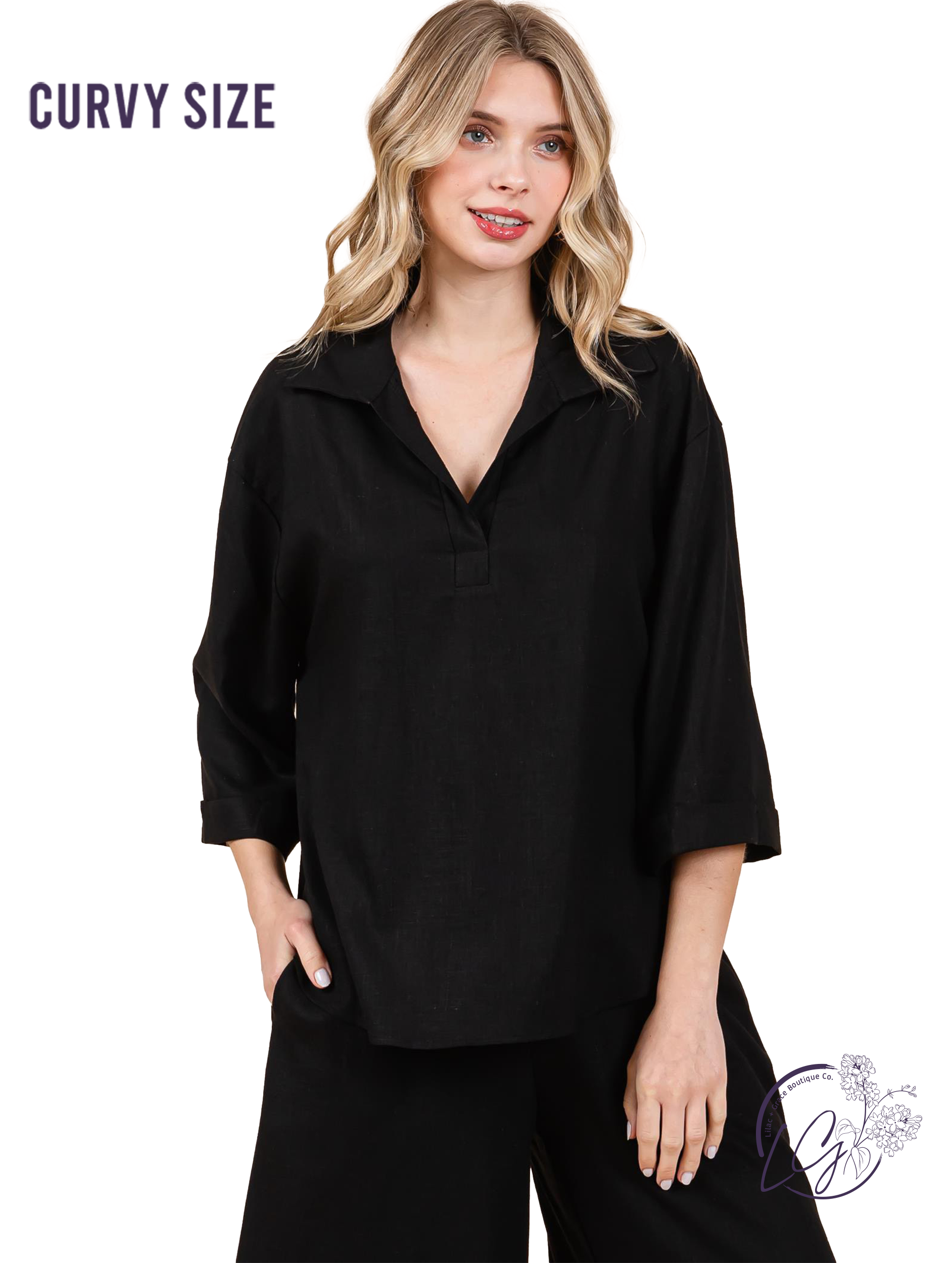Lighten up your wardrobe with our Light & Luxe Linen Shirt! With its sheer and comfortable design, this loose-fitting blouse is perfect for daily wear or as loungewear. Featuring a drop shoulder, v-neck collar, and 3/4 or short sleeve options, this top is both stylish and comfortable.