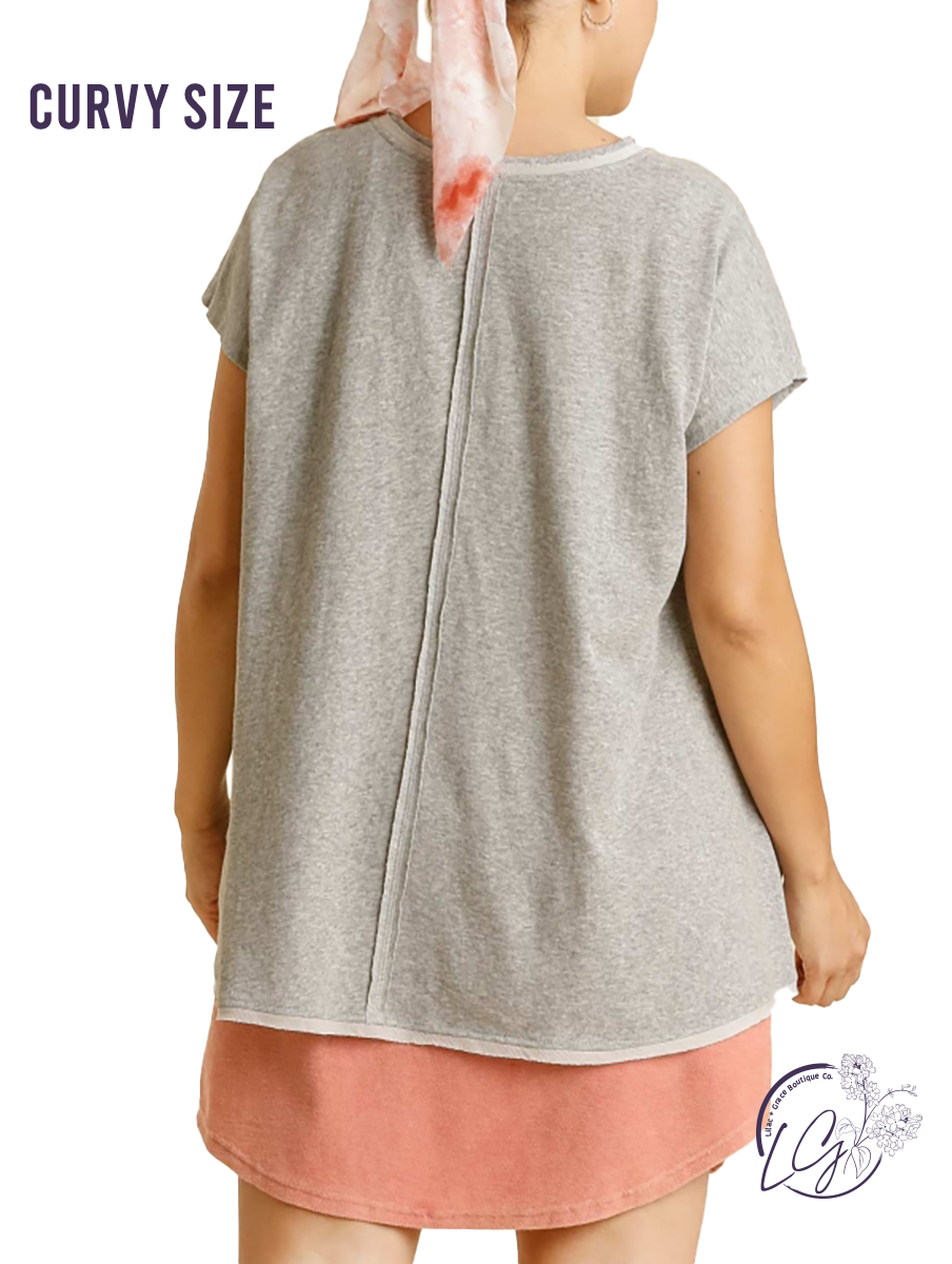 V-Neck Short Folded Sleeve Top with Side Slits and Raw Edged Hem