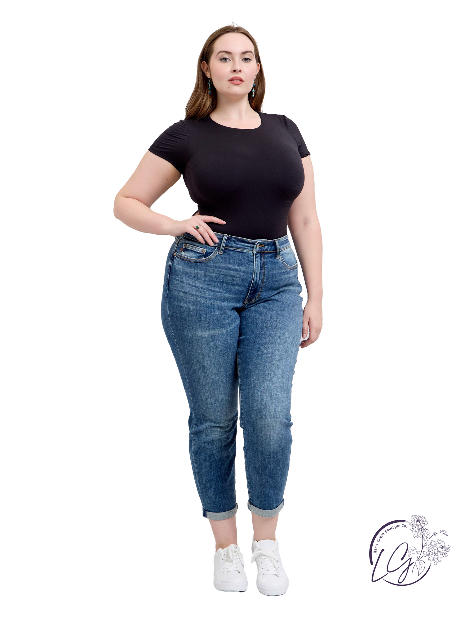The Marigold Mid-Rise Boyfriend Jeans by Judy Blue bring an effortless, relaxed feel to any wardrobe. Designed for comfort and style, these jeans feature a flattering mid-rise waist, a slouchy boyfriend cut, and a clean, non-distressed finish. The soft vintage wash enhances the laid-back aesthetic, while the cuffed or uncuffed styling allows for a breezy, flowy silhouette.