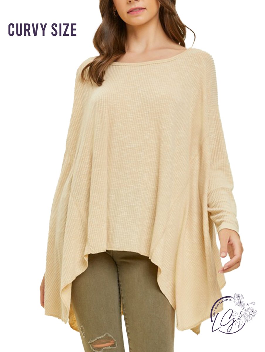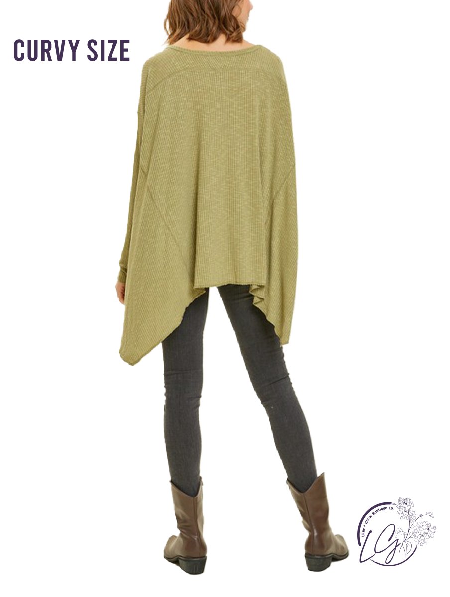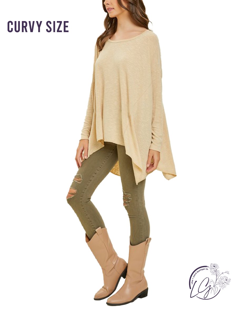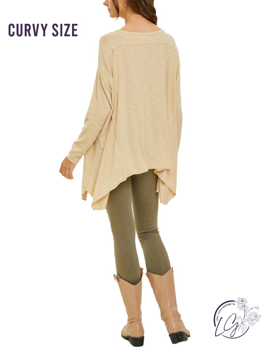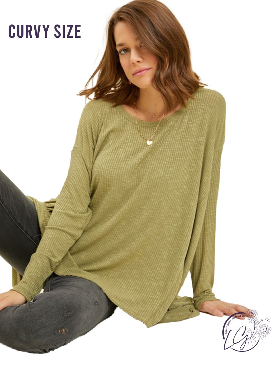 Introducing the "Curvy Mellow Mosaic Rib Layer Top," a luxurious and oversized addition to your wardrobe that seamlessly combines comfort with contemporary style. Crafted from super-soft ribbed fabric, this layering top is designed to cocoon you in a cloud of coziness.