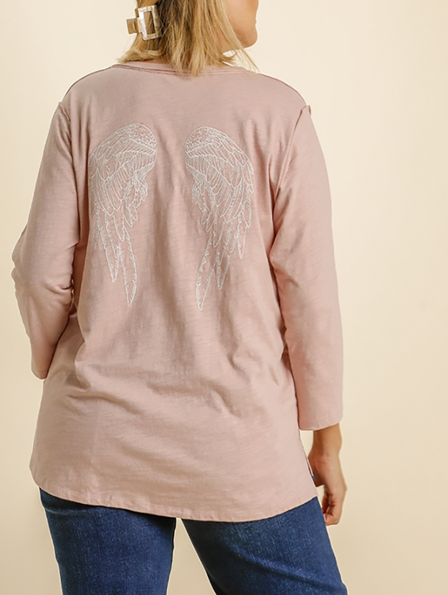 Curvy Back Angel Wing Embroidered Round Neck Top with Raw Edged Detail and Side Slits