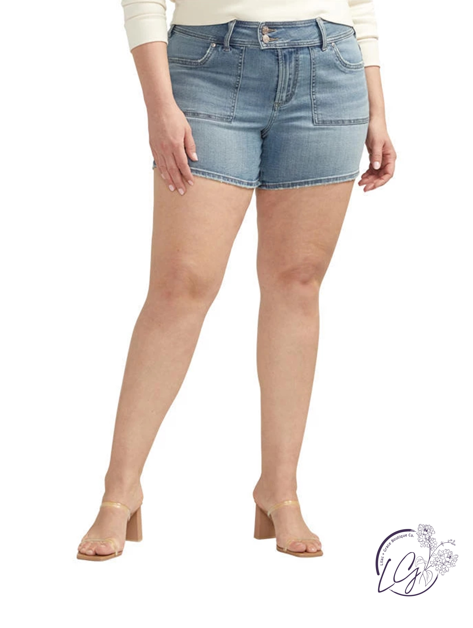Introducing the ultimate addition to your wardrobe - the Curvy Saige Suki Rise Power Stretch Short by Silver Jeans! With its premium construction and stylish design, these shorts will become a staple in your closet. Upgrade your outfit rotation with the Suki Mid Rise Power Stretch Curvy Fit - a must-have for any fashion-forward individual.