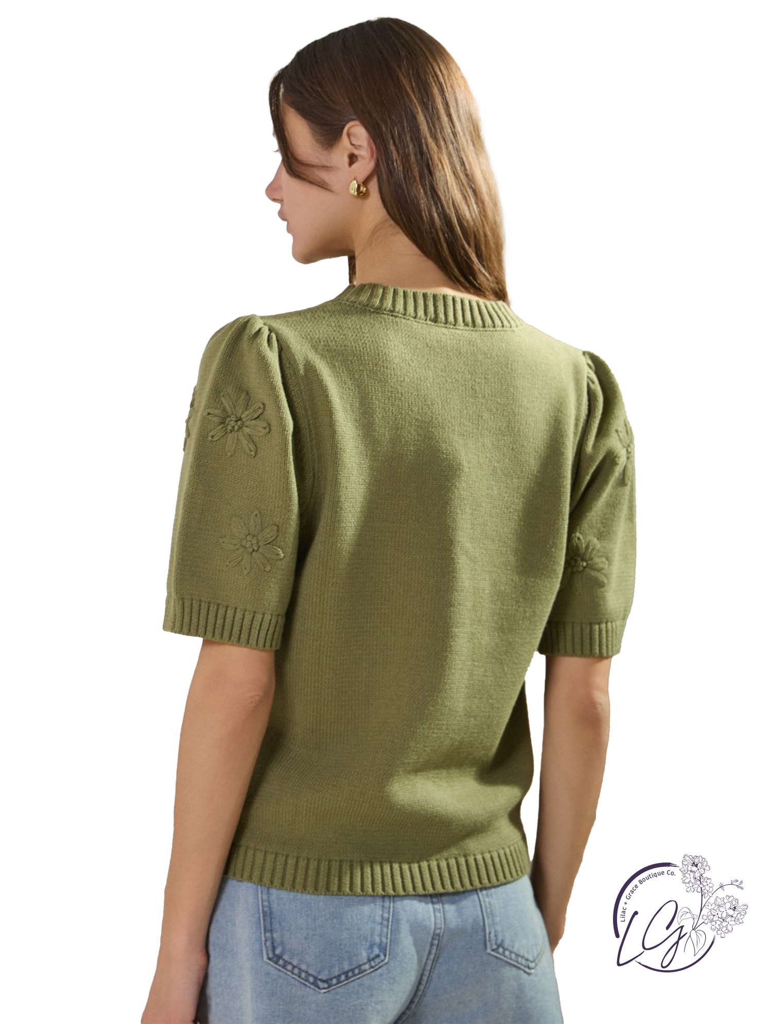This short sleeve knit sweater features a delicate flower motif woven into its soft, textured stitch. The classic crew neckline and easy fit make it perfect for everyday wear, while the subtle floral detail adds a playful, feminine touch. Pair it with high-rise denim or layer it over a slip dress for a cozy, styled finish.