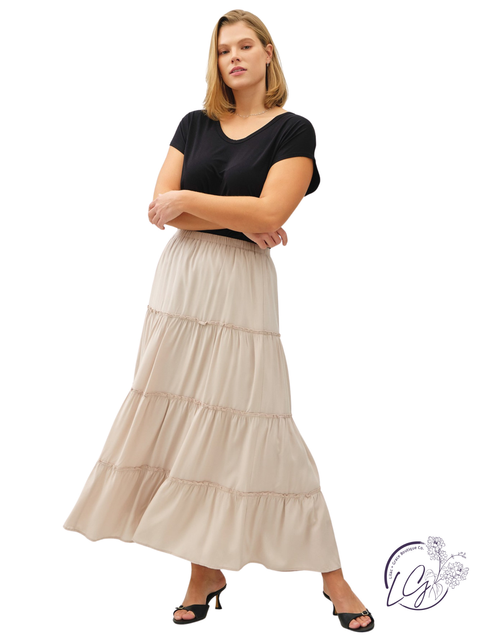 Step into summer with the Curvy Steps On Stone Skirt! This playful maxi skirt features a comfy elastic waistband and easy pull-on style, making it perfect for any sunny day adventure. The tiered design and ruffled hem add a flirty touch, while its flattering fit ensures you feel confident and carefree. Versatile enough to dress up or down, this skirt is your new go-to for effortless summer style.