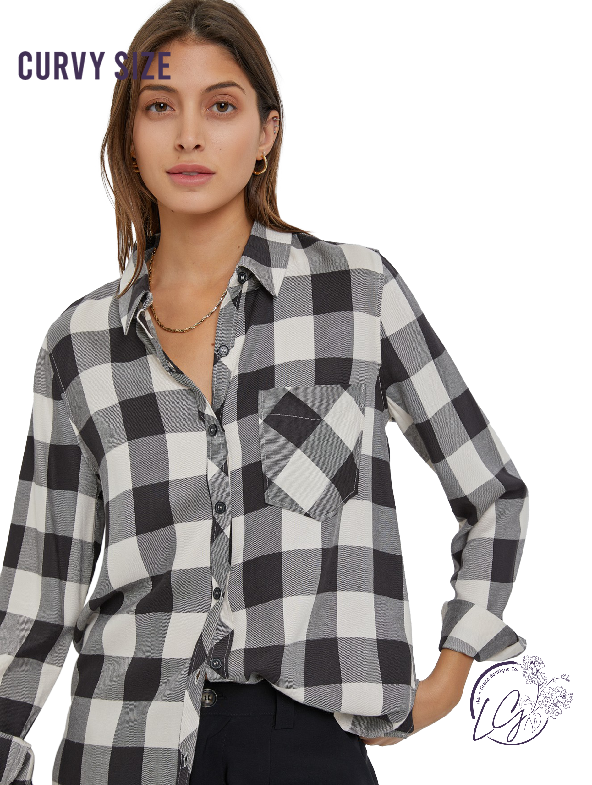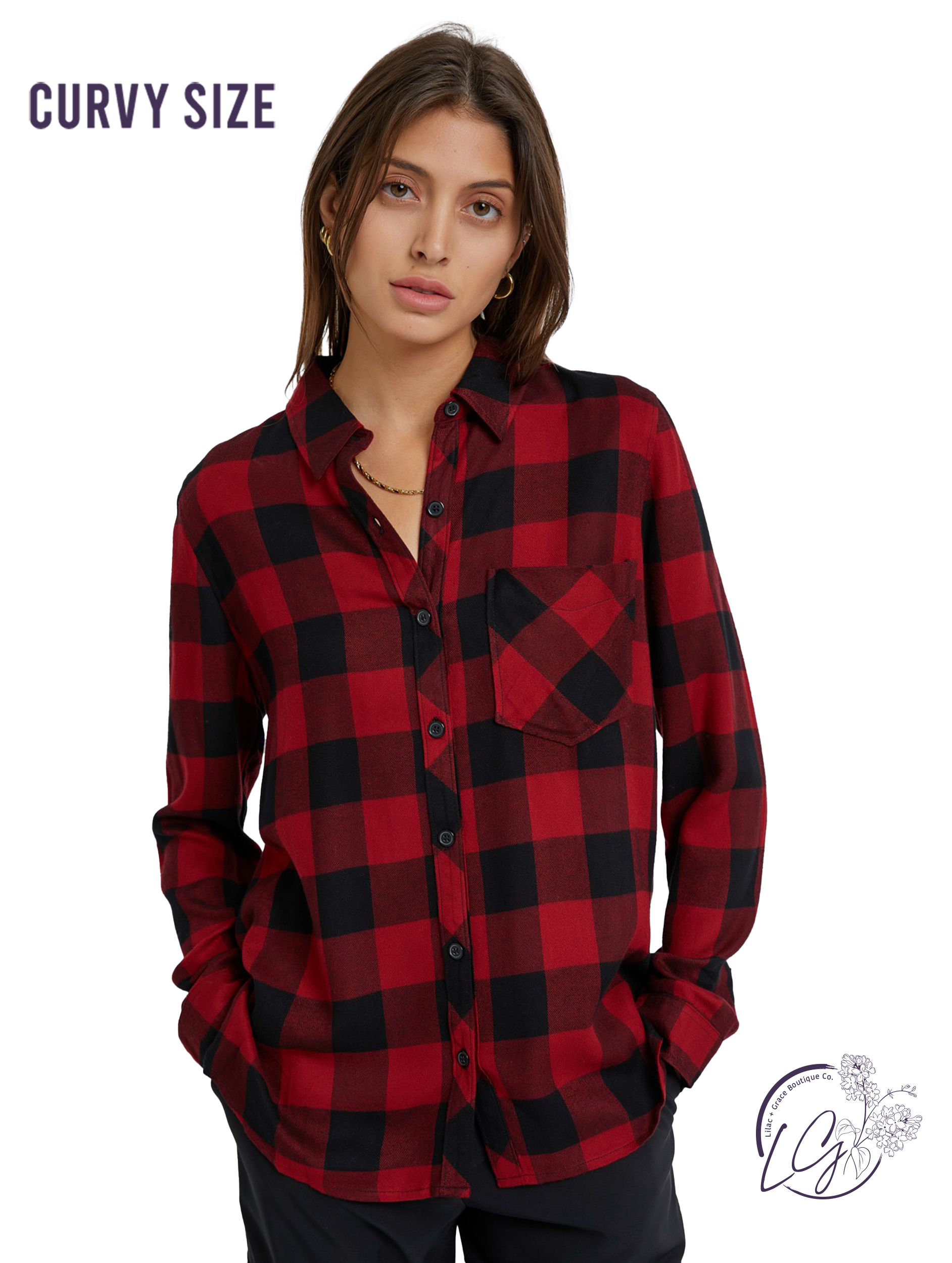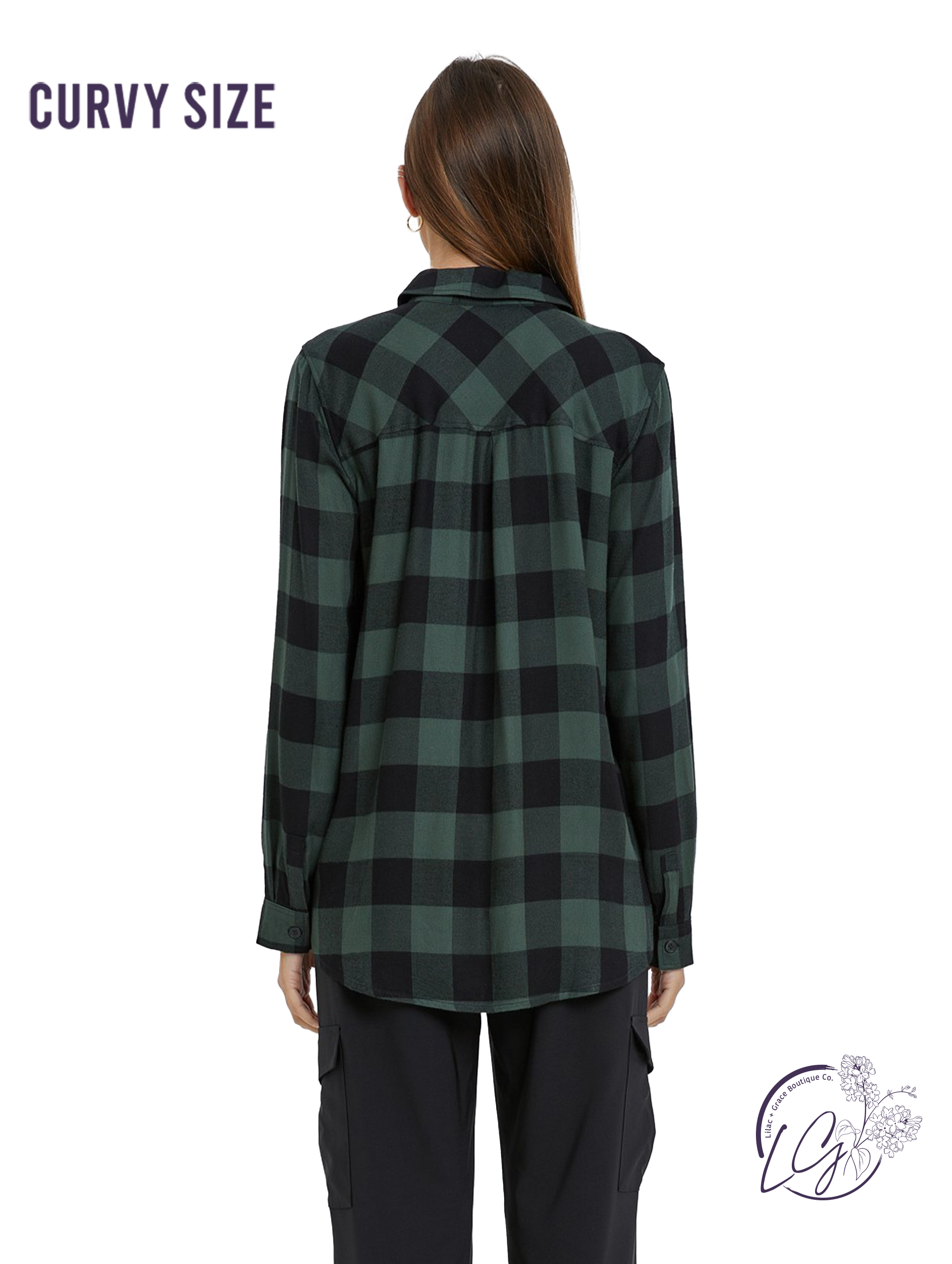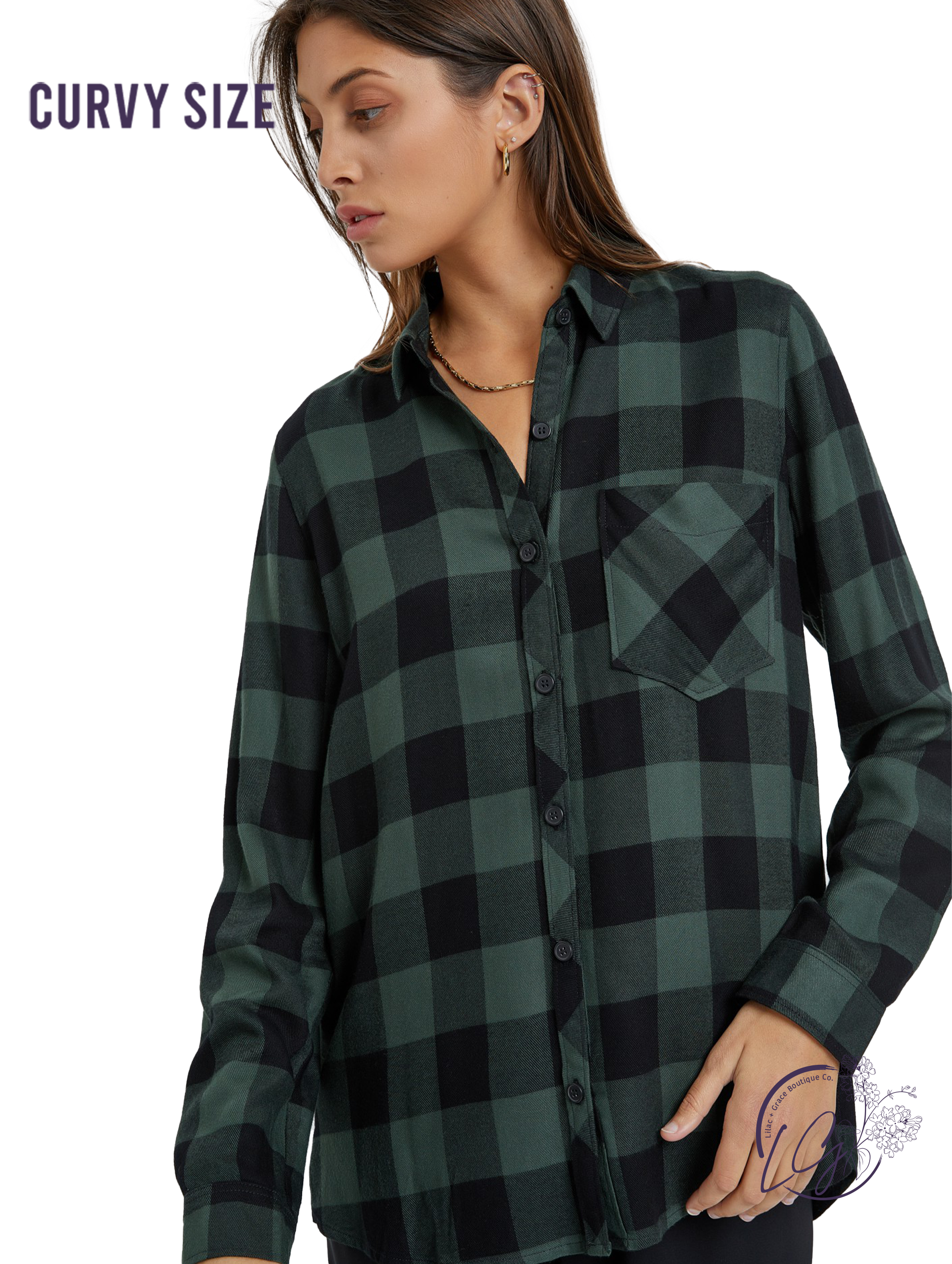 The Curvy Timber Trail Flannel is your go-to piece for cozy, outdoorsy style with a modern twist. Designed with a relaxed fit for maximum comfort, this plus size flannel shirt features classic plaid patterns in rich, earthy tones. The soft, breathable fabric keeps you warm without feeling bulky, while the button-up front and cuffed sleeves offer versatile styling options. Whether you're layering it over a tee for a casual day out or pairing it with jeans for a rugged yet chic look, the Timber Trail Flannel is the perfect blend of comfort and timeless charm, ideal for everyday adventures.