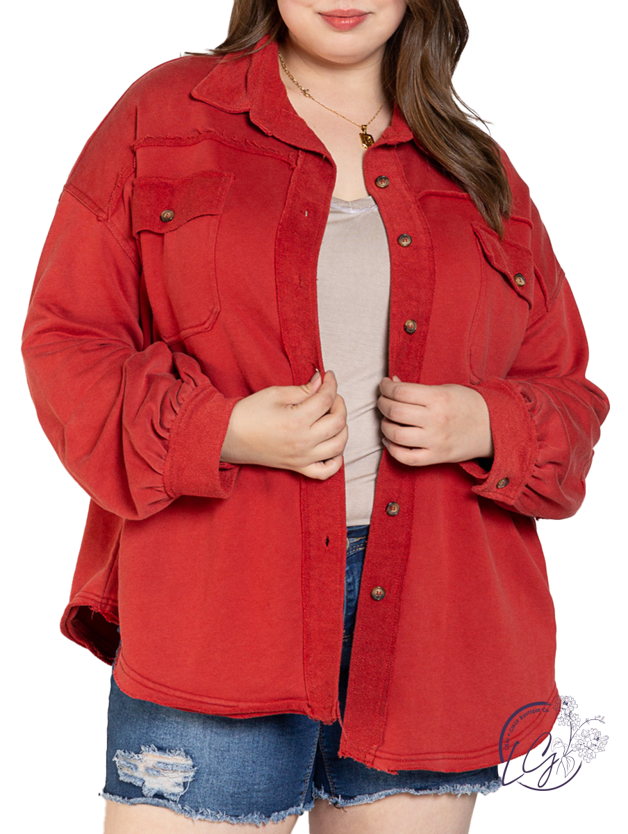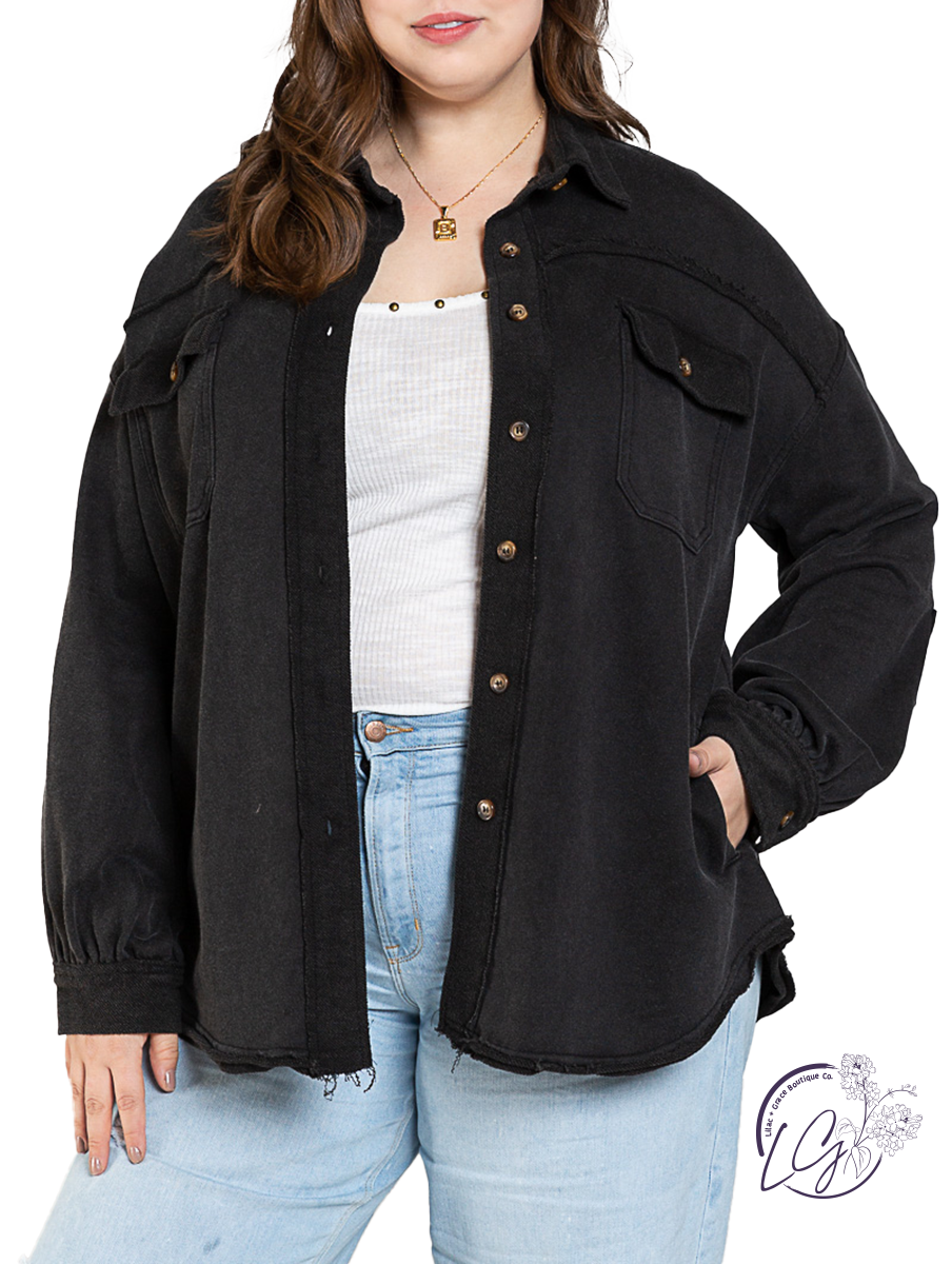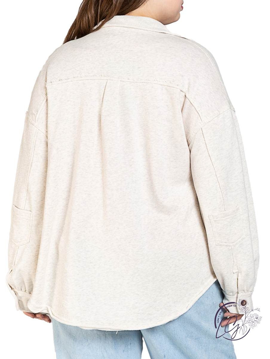 Classic pieces are everyone's favorite and our "Curvy Upgrade The Classic Look" french terry oversized jacket will be the new "classic" piece to keep in your closet. Designed in a relaxed oversized fit with vintage washed out colorway. A french terry (sweatshirt) fabric that has been flipped with inside being on the outside on the collar, button front placket closure and sleeve band for vintage vibe. A jacket with 4 pockets with 2 flap pocket on front bust and 2 bottom side pockets and finished with raw seam detailing and edge on body.