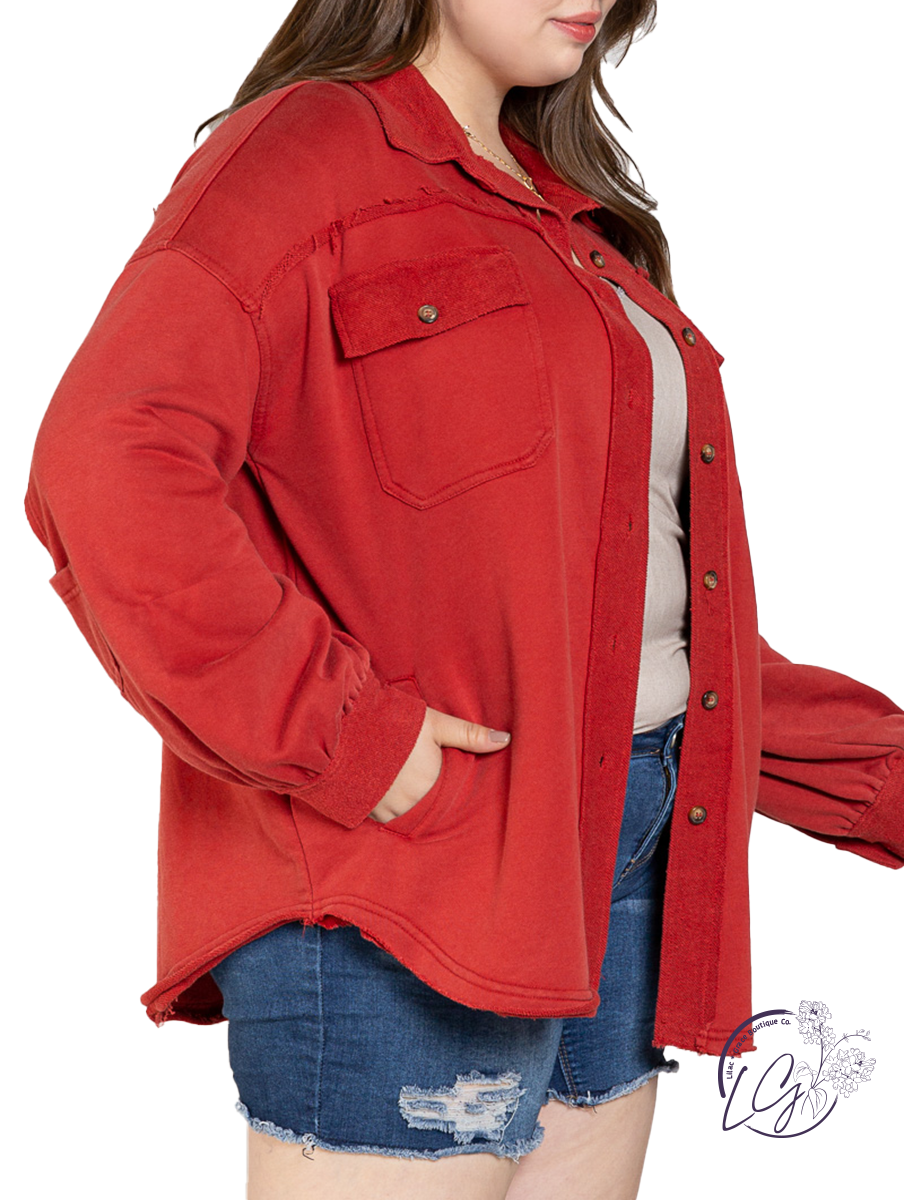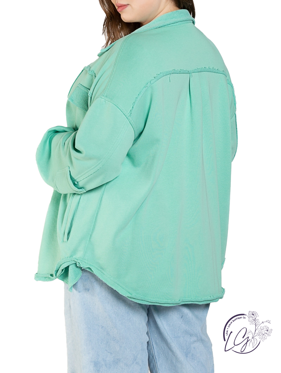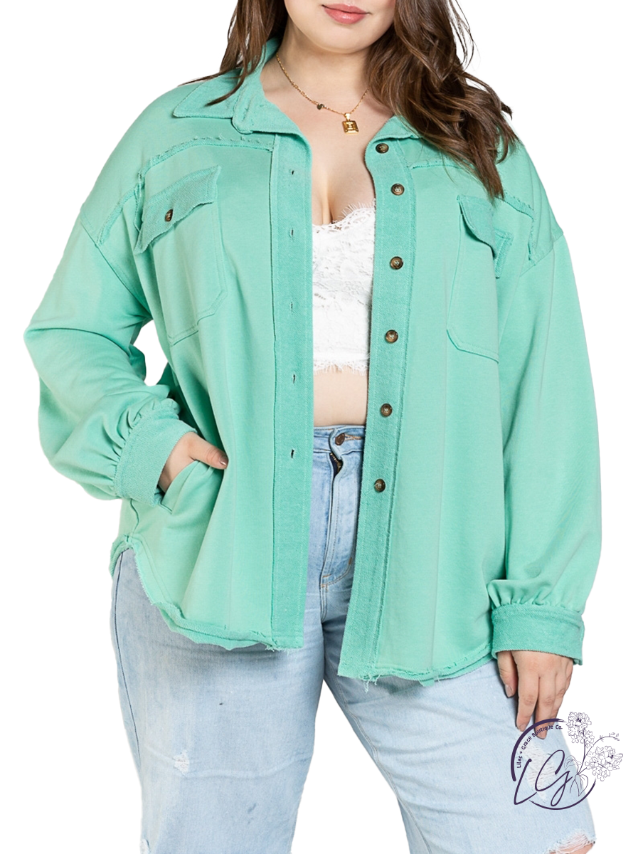 Classic pieces are everyone's favorite and our "Curvy Upgrade The Classic Look" french terry oversized jacket will be the new "classic" piece to keep in your closet. Designed in a relaxed oversized fit with vintage washed out colorway. A french terry (sweatshirt) fabric that has been flipped with inside being on the outside on the collar, button front placket closure and sleeve band for vintage vibe. A jacket with 4 pockets with 2 flap pocket on front bust and 2 bottom side pockets and finished with raw seam detailing and edge on body.