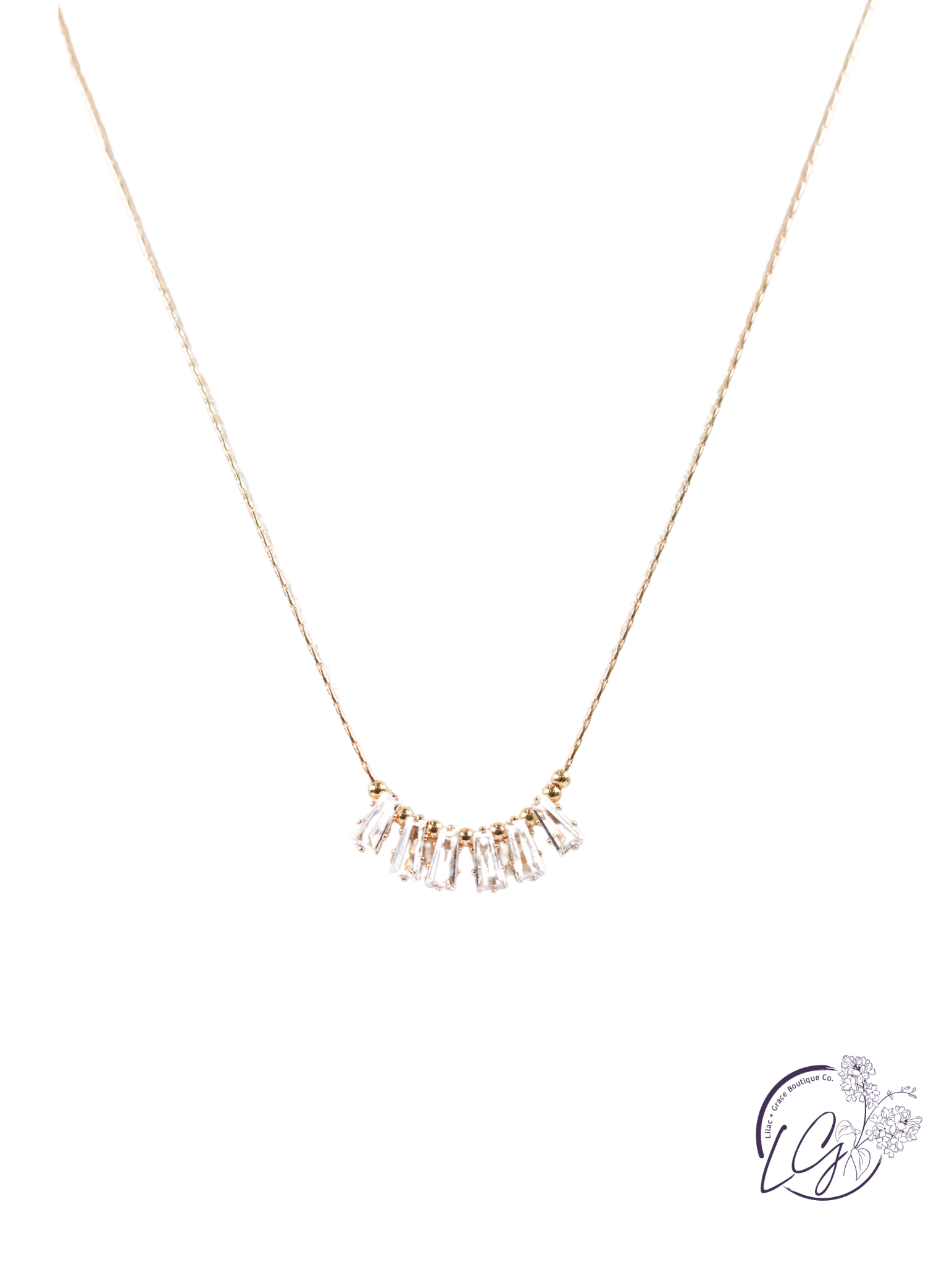 Elevate your everyday style with this elegantly understated necklace. Featuring a delicate chain, this piece showcases a gracefully curved bar adorned with a series of dazzling baguette-cut crystals. Each crystal is individually wrapped, creating a subtle sparkle that catches the light beautifully. Perfect for layering or wearing on its own, this necklace adds a touch of modern sophistication and radiant charm to any outfit.