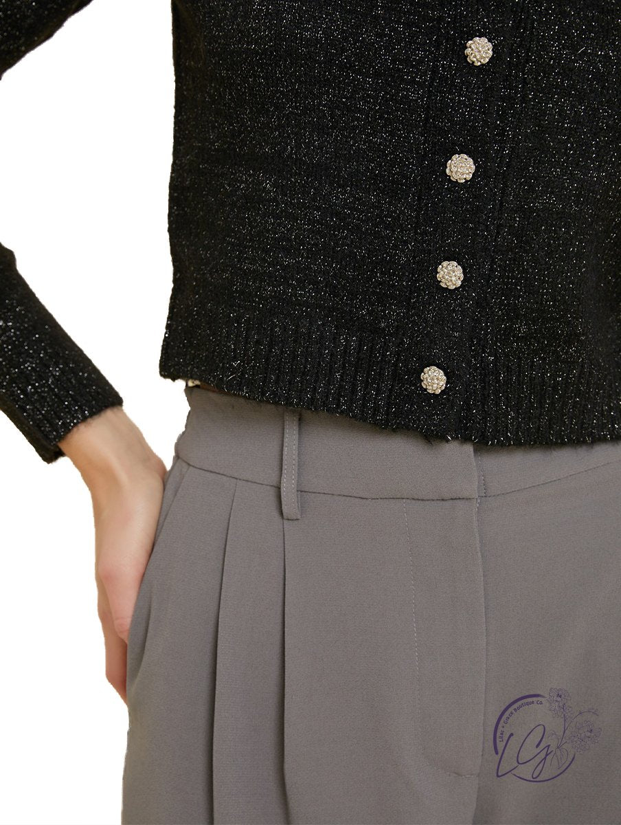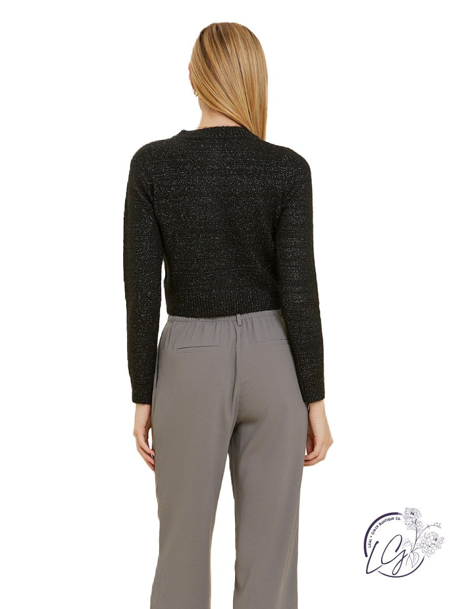 Crafted from our luxe material, this cardigan not only provides a sumptuously soft feel against the skin but also introduces a subtle shimmer that adds a sparkly flair to your fall and holiday looks. The blend of comfort and glamour makes it a versatile choice for both casual and more formal occasions.
