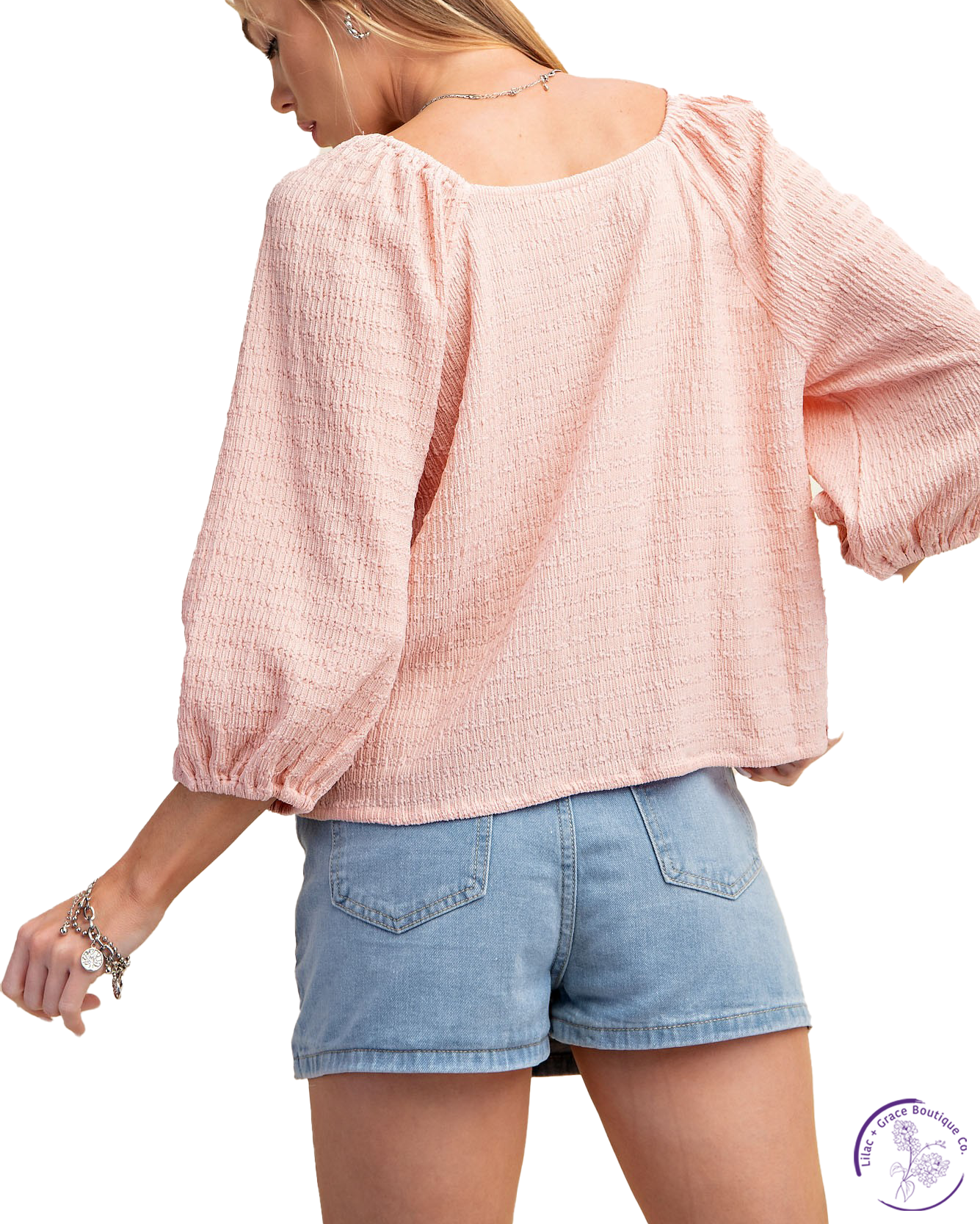 Embrace your dreamy, feminine side in our Bubble Sleeve Knit Top! With its soft and stretchy texture,has a little weight to it, this V neck top is perfect for everyday wear. The eye-catching bubble sleeves add a touch of whimsy and charm to any outfit. Enjoy the comfort and versatility of a 3/4 sleeve that can be dressed up or down. Elevate your wardrobe with this must-have piece.