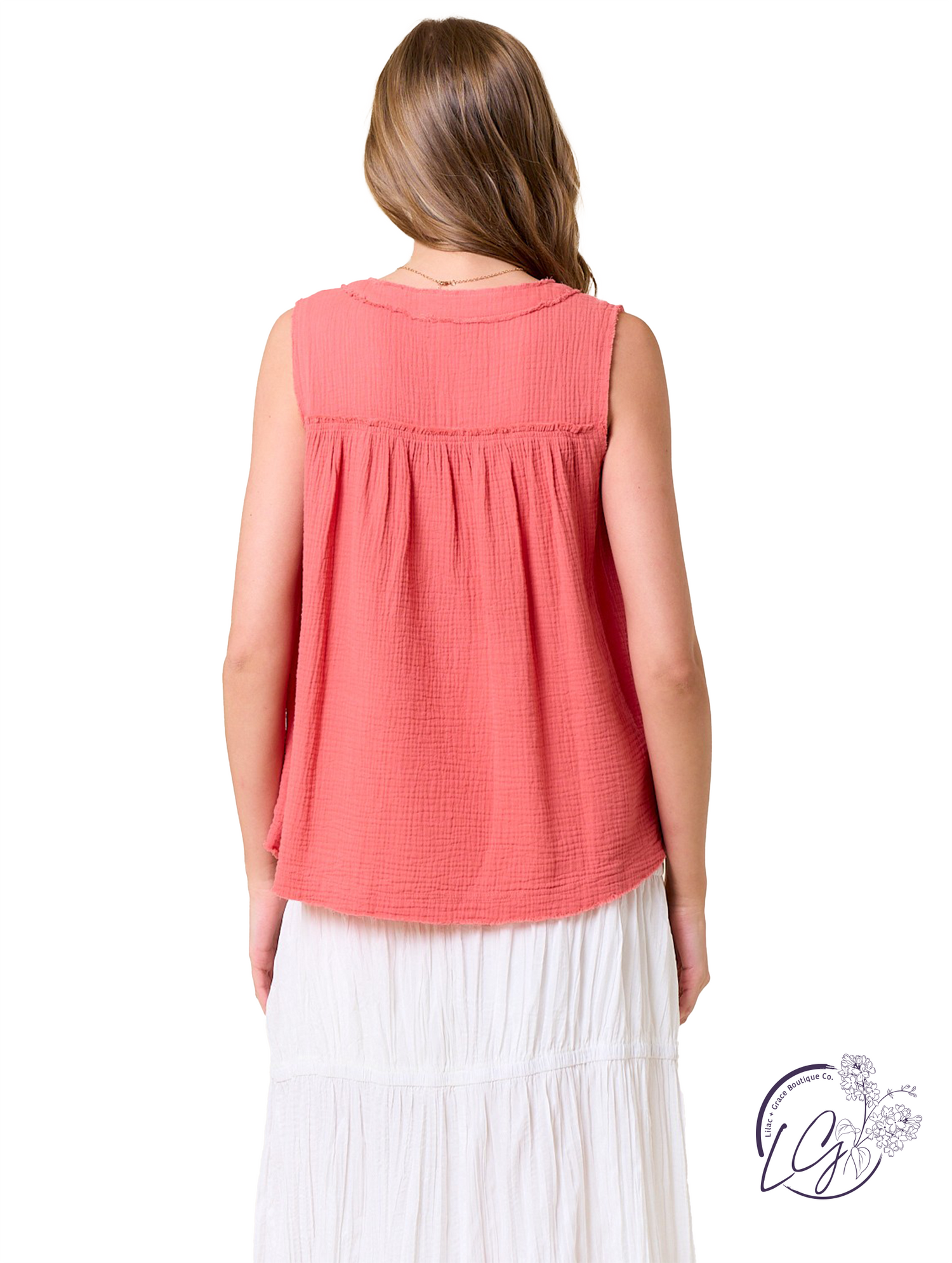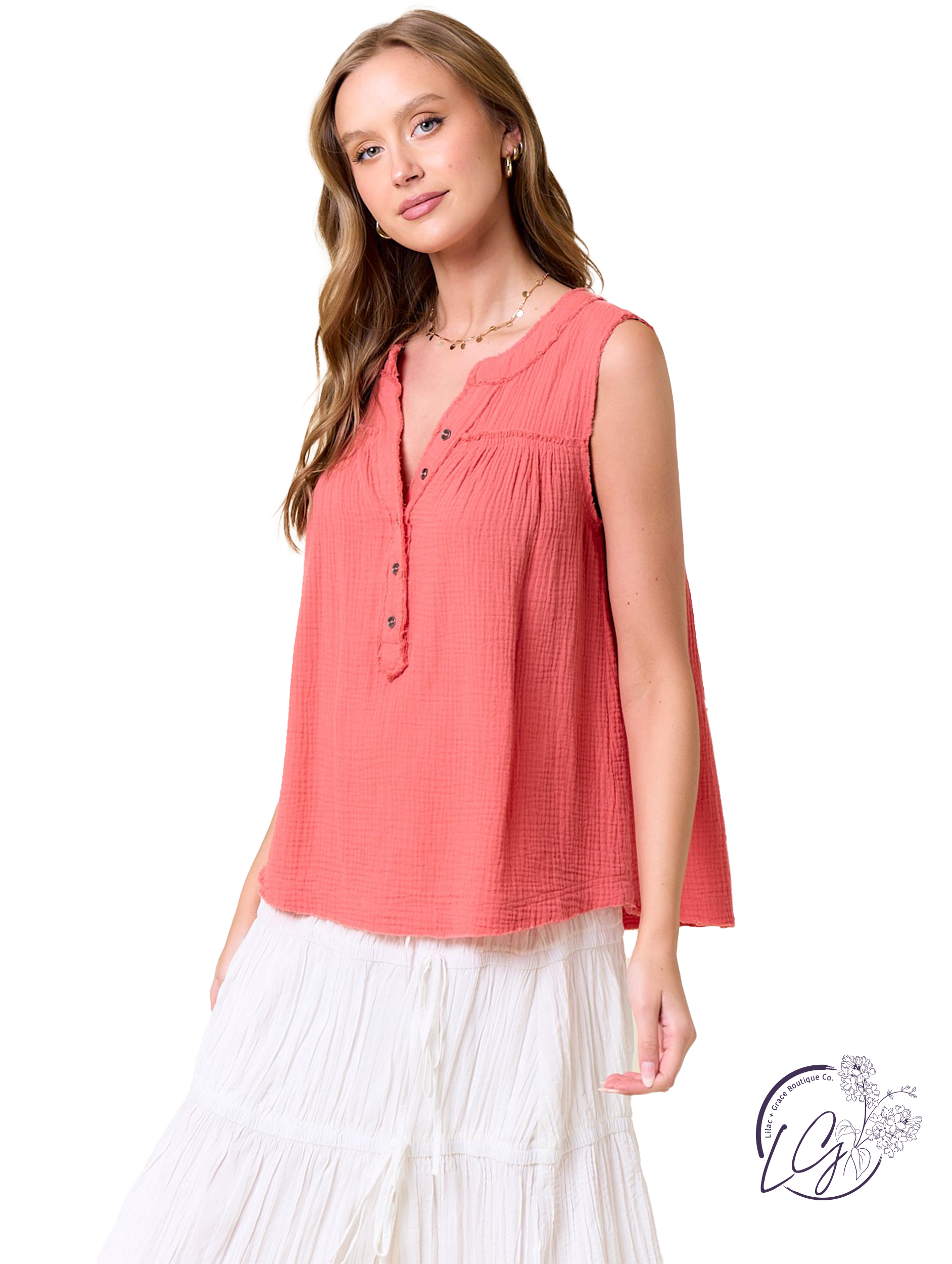 Update your warm-weather wardrobe with this washed cotton gauze sleeveless Henley top. Featuring a split V-neckline accented by a subtle button placket, this top combines easygoing style with feminine detailing. Pintuck stitching and raw-edge finishes add texture and visual interest, while the rounded hemline complements its relaxed silhouette. Pair it casually with shorts and sandals, or tuck it into high-waisted pants for a polished yet relaxed look.
