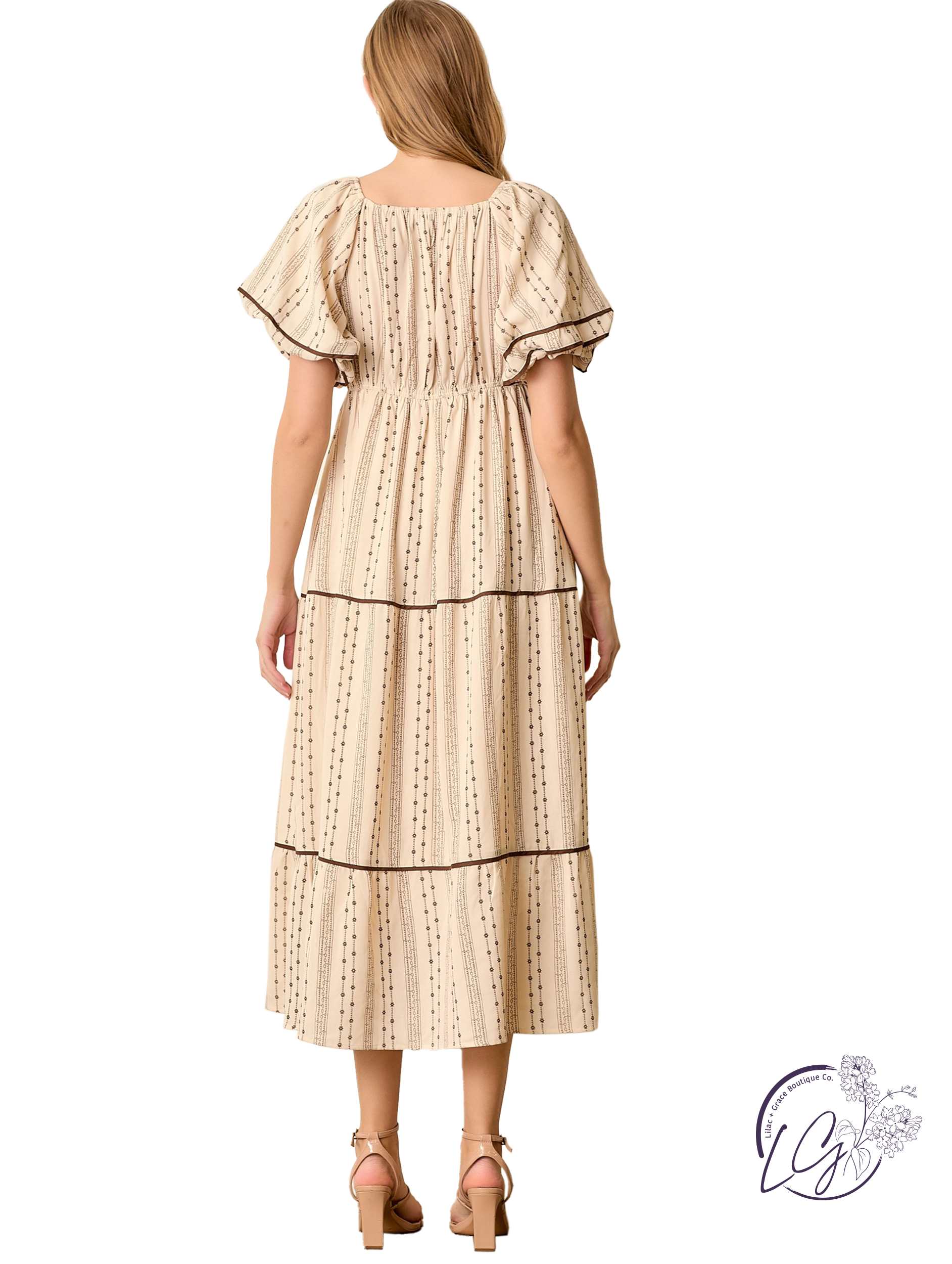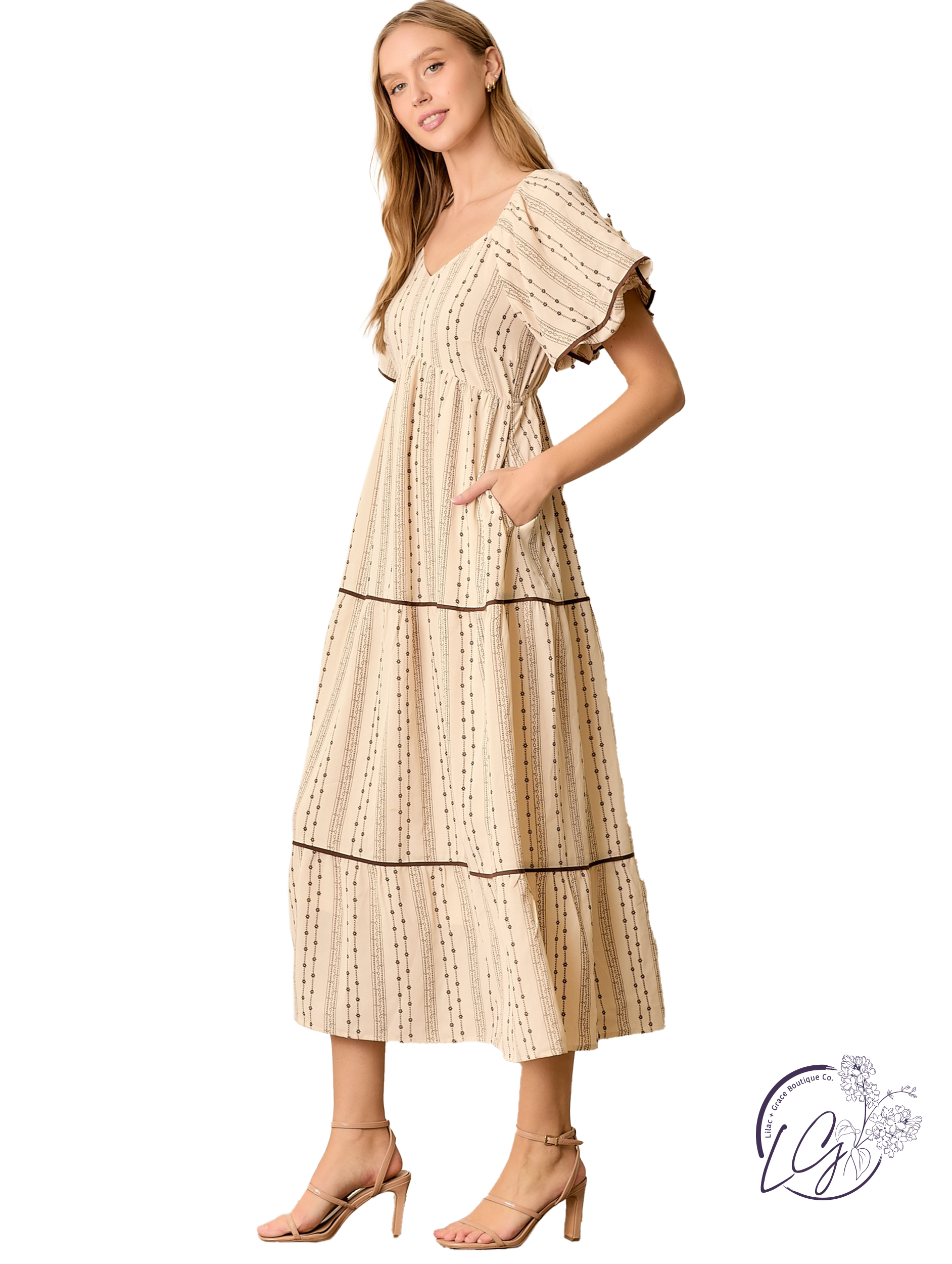 Laid-back elegance with this contrast stripe maxi dress, designed with a flattering V-neckline and soft puff sleeves for a touch of volume. The bold stripe pattern is balanced by subtle contrast detailing, creating visual interest from every angle. Functional side pockets add practicality, while the relaxed silhouette flows with ease. Pair it with slides for daytime strolls or dress it up with statement earrings and sandals for a casual-chic evening look.