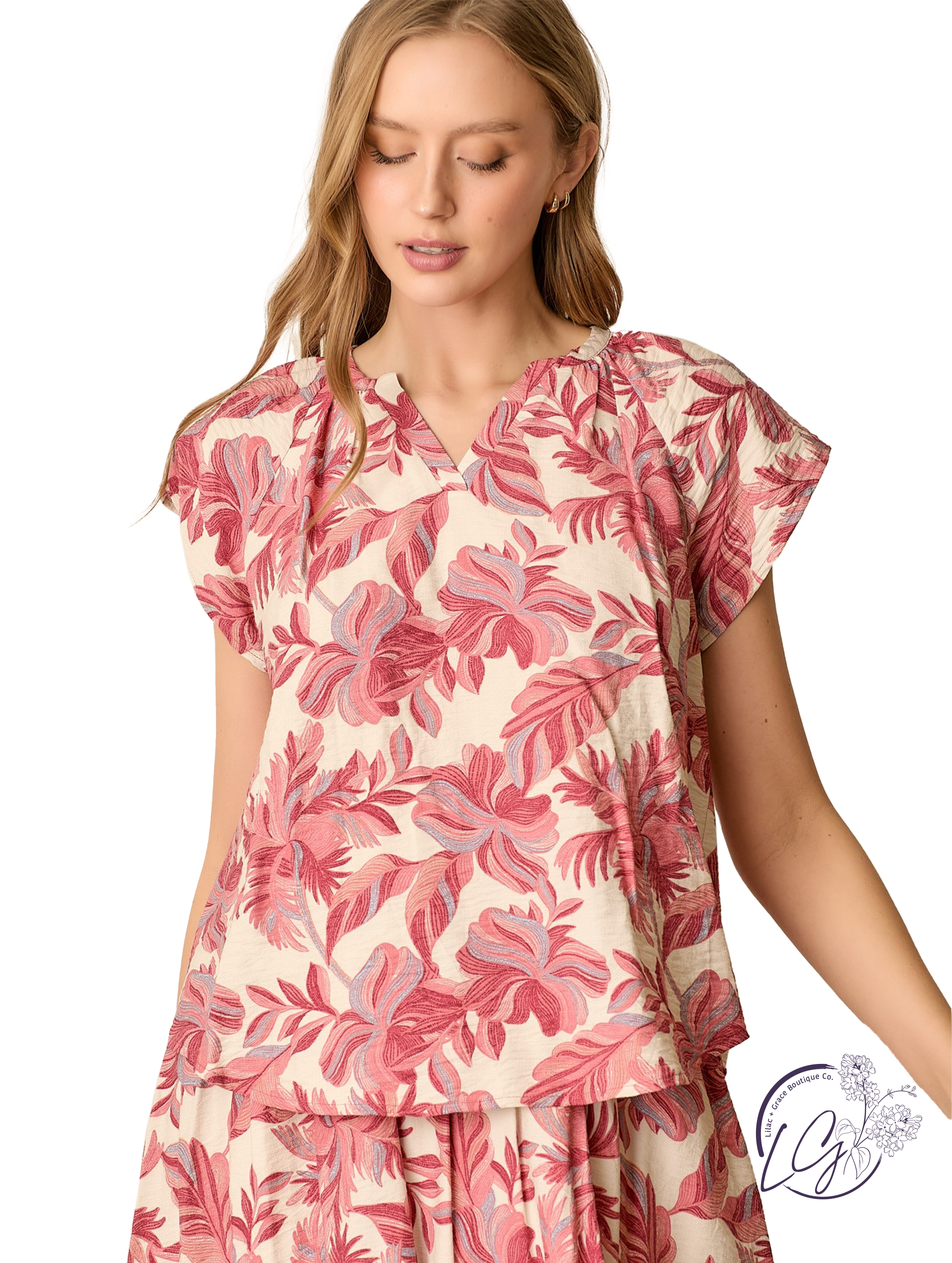 This printed short sleeve top features a flattering v-neckline and airy fly-away sleeves for a soft, breezy look. Adorned with an allover leaf print, it brings a touch of nature-inspired charm to any outfit.
