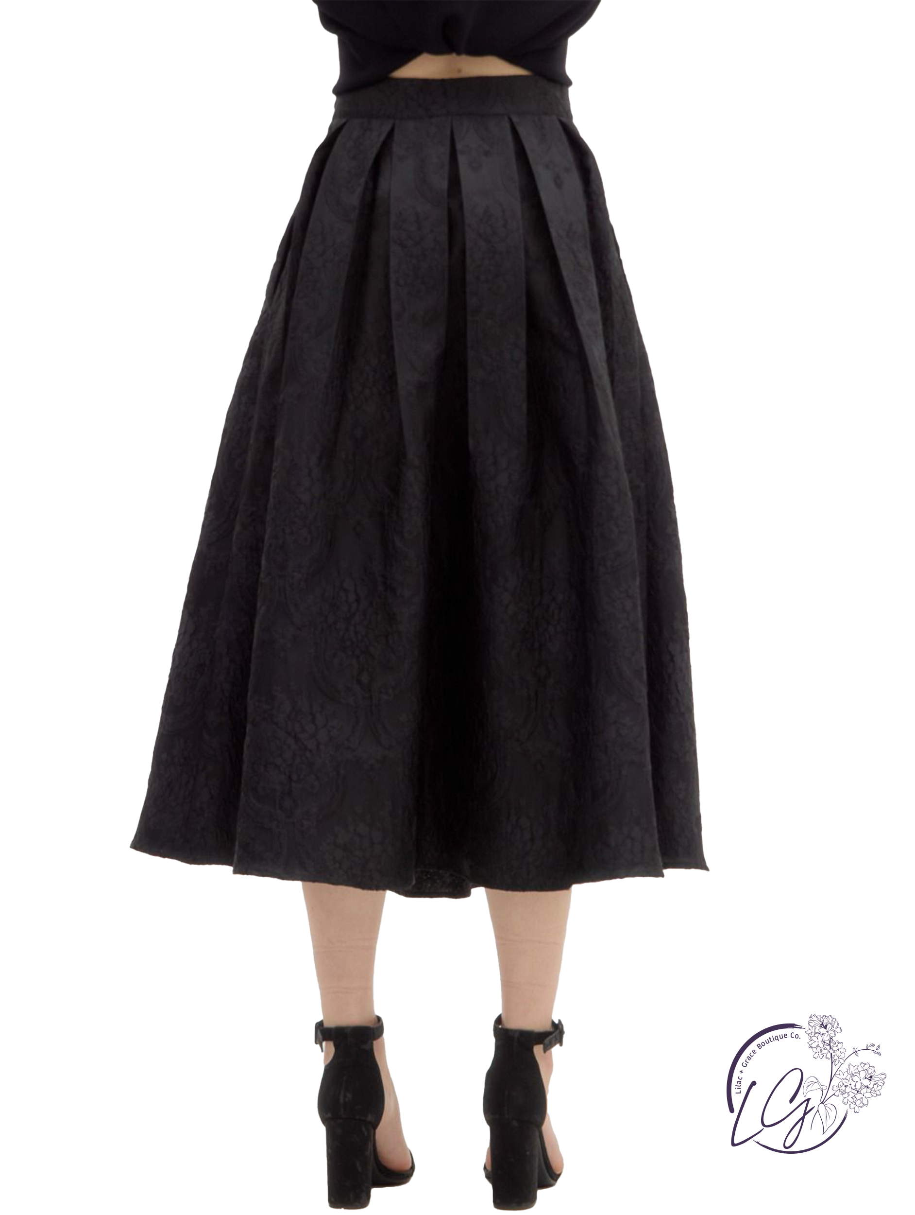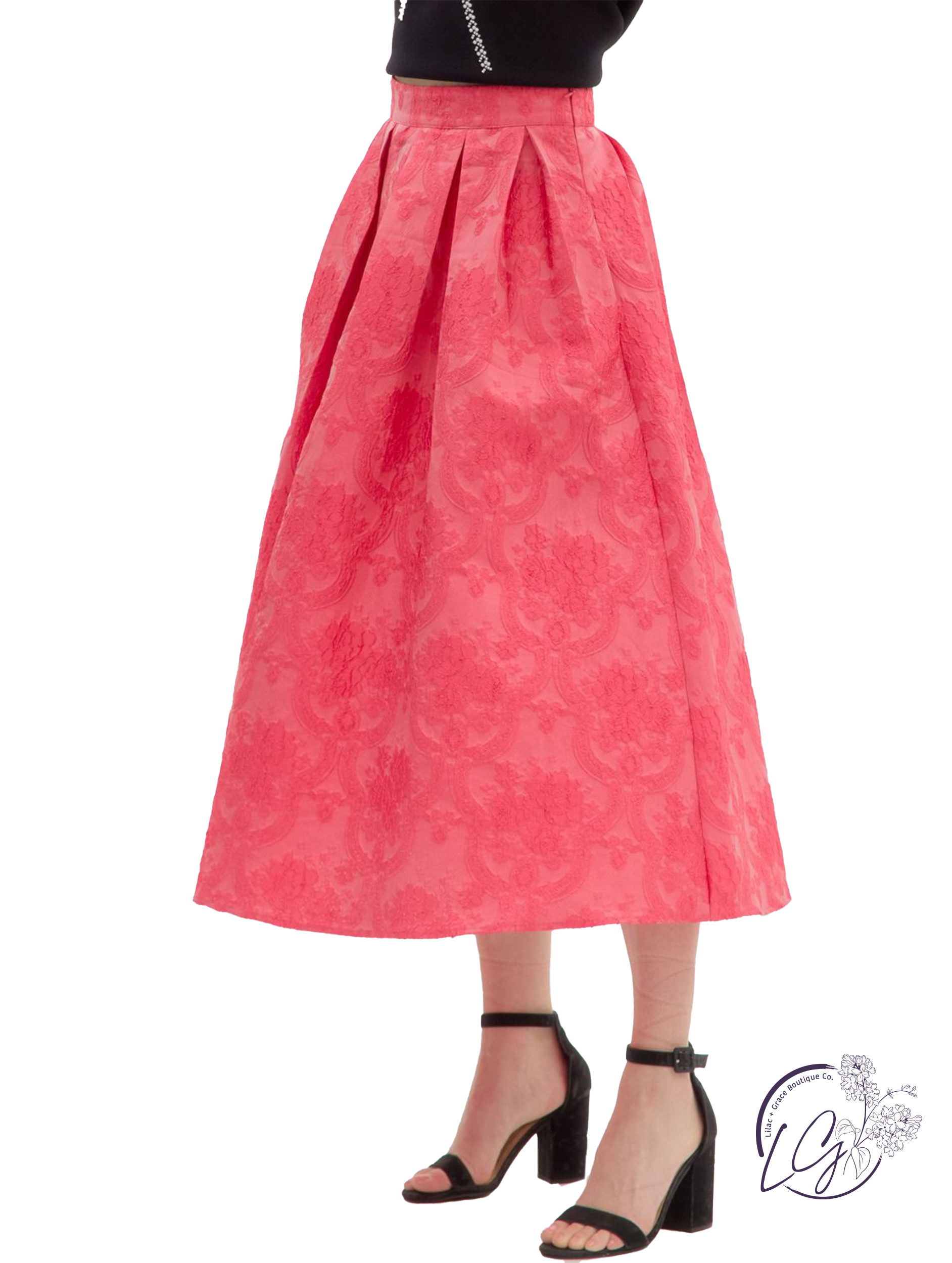 This floral jacquard pleated midi skirt features a side zipper closure for a clean, tailored fit. Crafted from lightweight woven fabric, it's unlined, non-sheer, and designed to move with ease. The pleated construction adds soft structure, making it a versatile piece for both elevated and everyday looks. Pair it with a tucked-in blouse or a cropped knit for an effortlessly refined outfit.