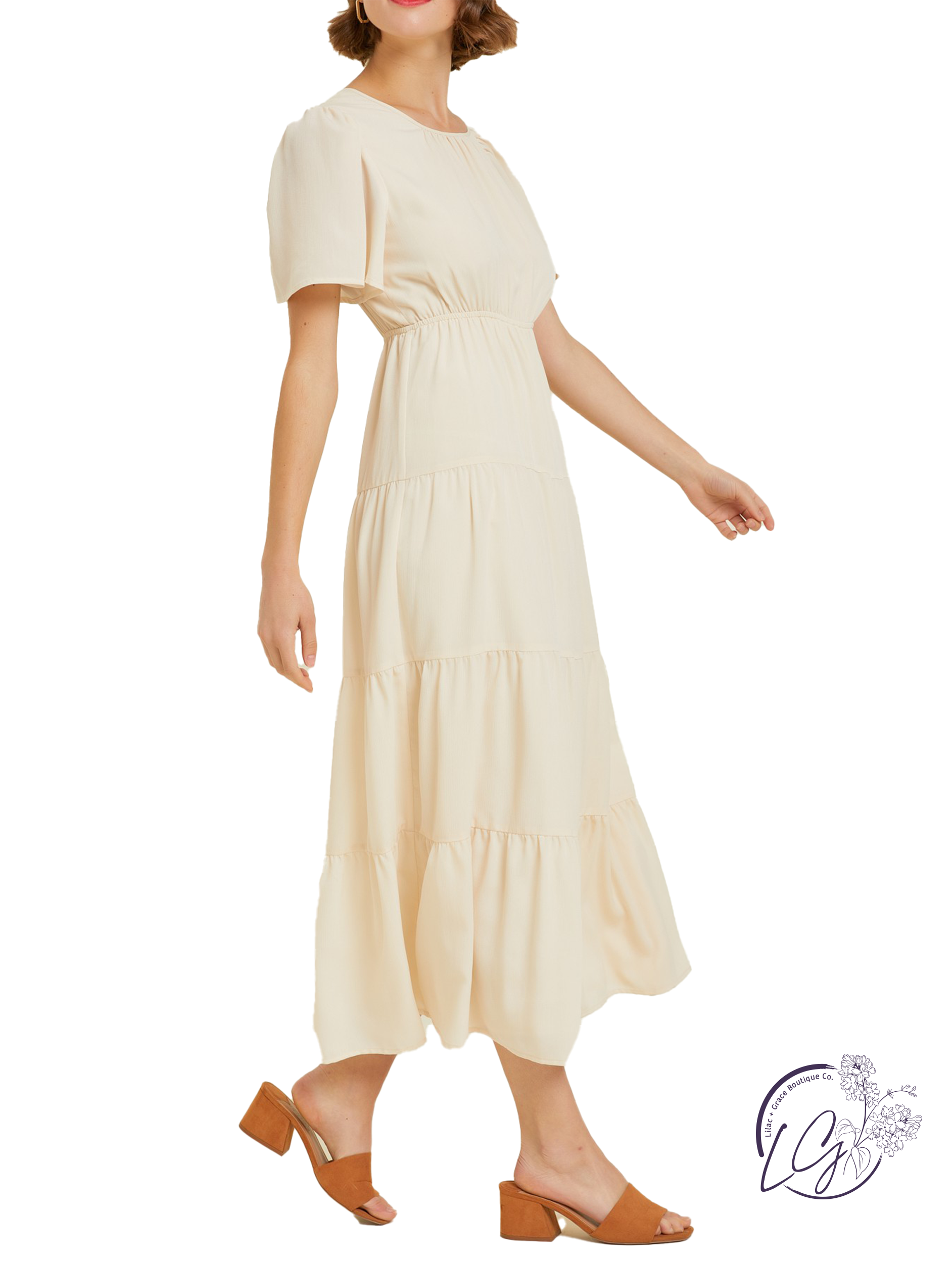 Experience pure elegance and grace in our Elegant Ease Tiered Midi Dress. This sheer, feminine dress features delicate tiered ruffles, short bell sleeves, and an elastic waist for a flattering fit. With a lining included, you'll feel comfortable and confident as you showcase your style.