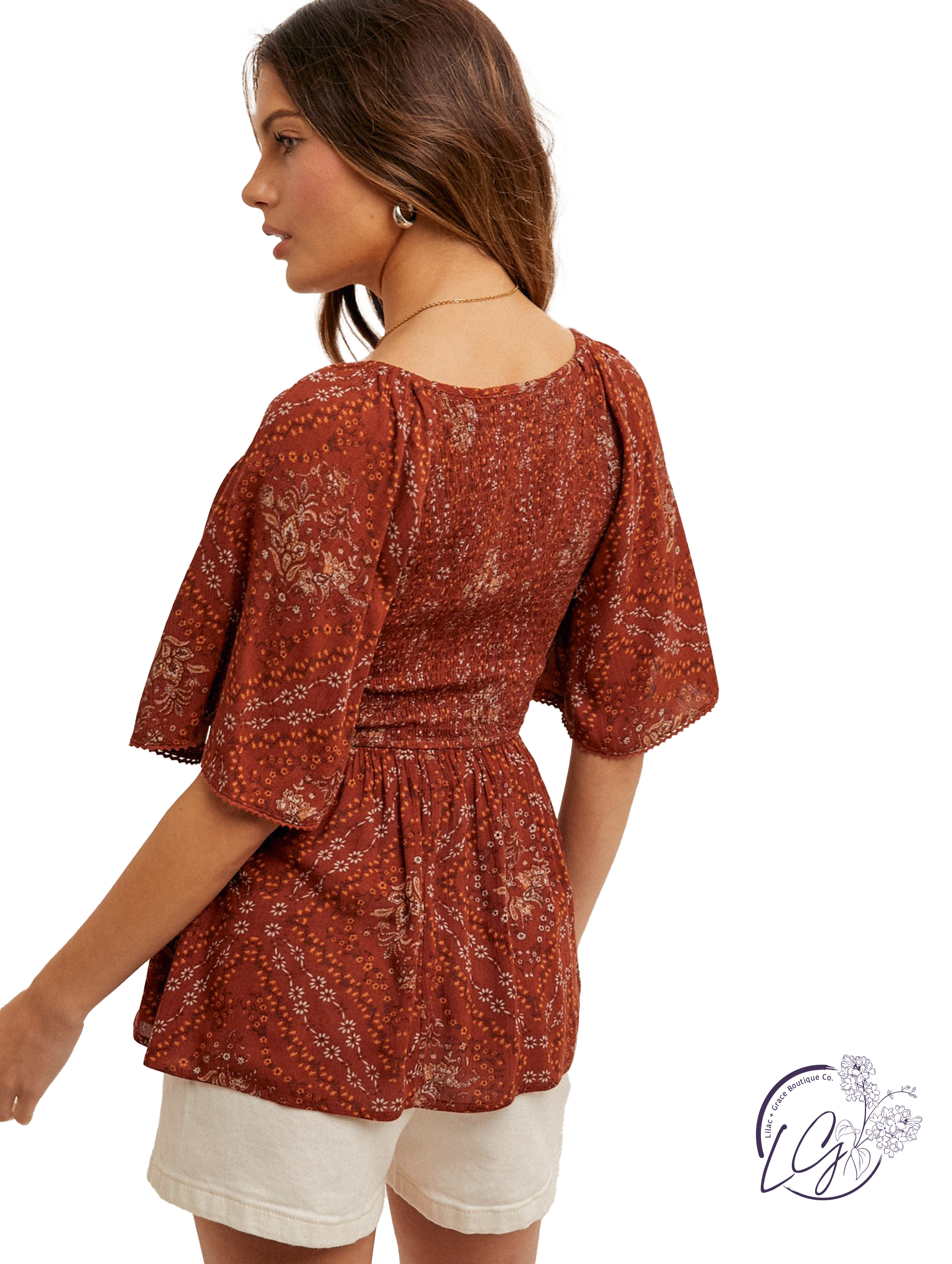 Indulge in the beauty of nature with the Fields Of Asters Top. Featuring a delicate floral print, flutter sleeves, and a smocked peplum design, this top exudes feminine charm. Embrace your inner flower child and stand out with this elegant yet playful piece.