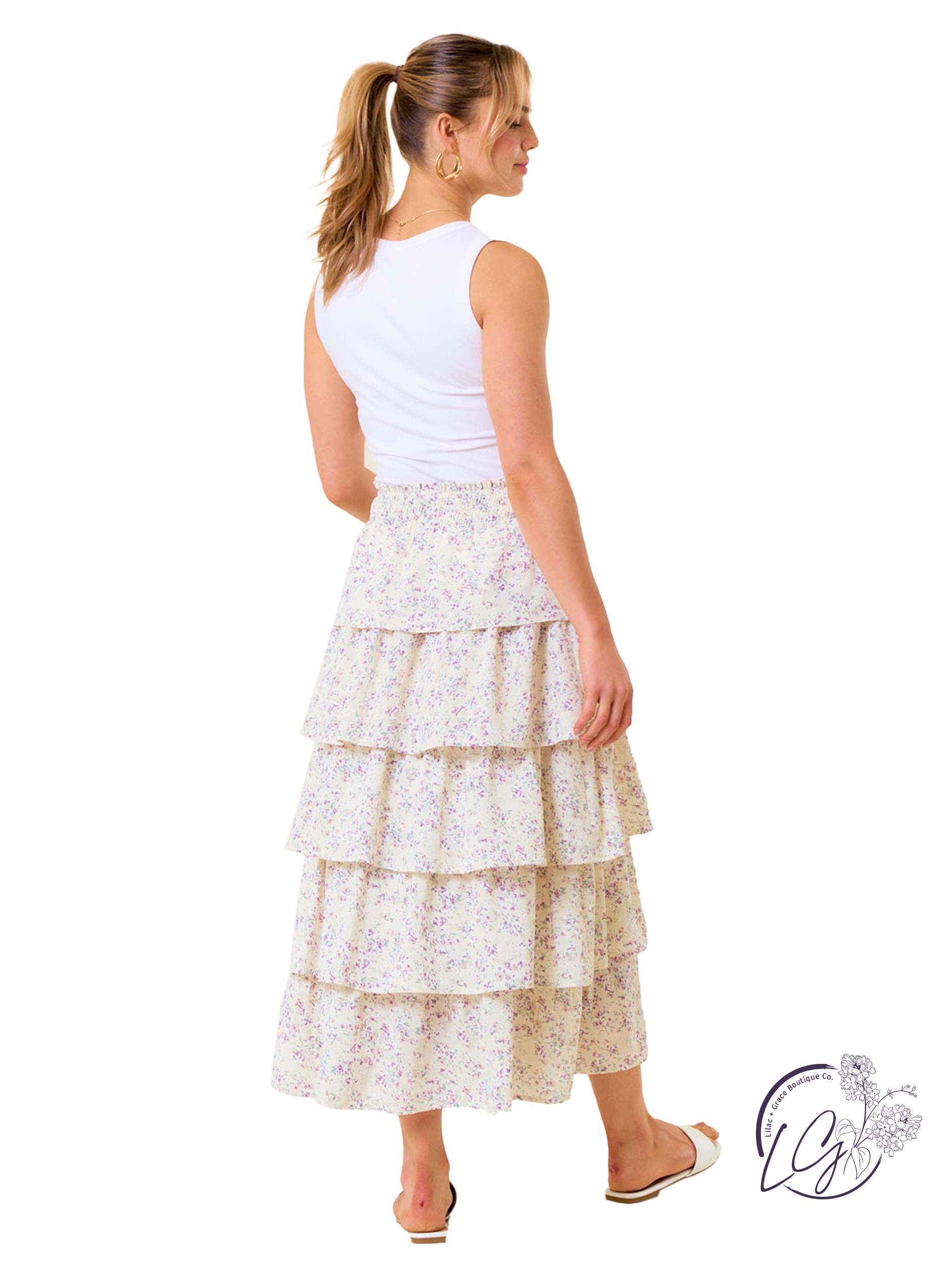 Make this airy midi skirt your go-to piece for effortless romance. Crafted from lightweight bubble crepe fabric, it features five dreamy, ruffled tiers that cascade beautifully with every step. The smocked elastic waistband ensures a comfortable, flexible fit while adding delicate texture. A soft pastel print enhances its gentle charm. Pair this skirt with a tucked-in blouse and sandals for a daytime look, or elevate it with heels and minimal jewelry for special occasions.
