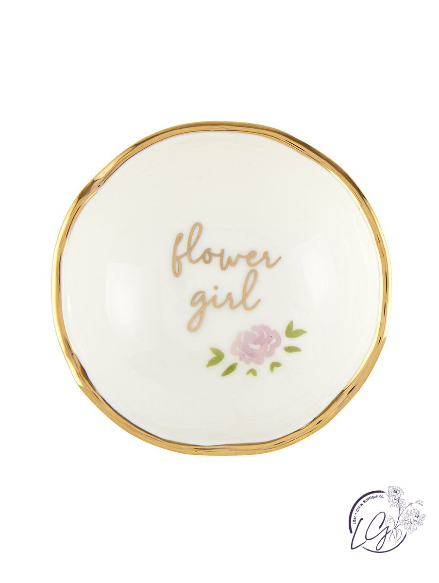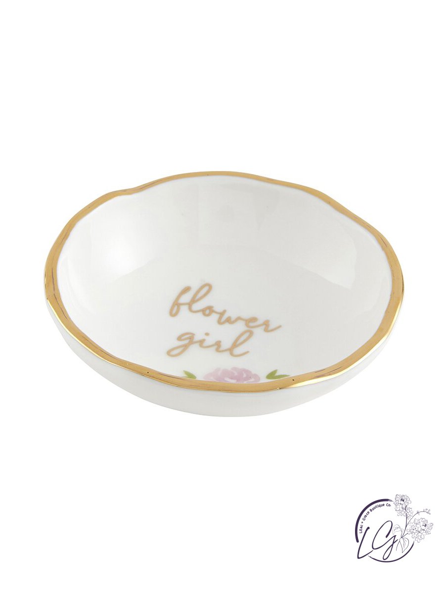 A charming and delicately crafted jewelry dish enscribed with the endearing phrase "Flower Girl." This exquisite trinket holder is designed to add a touch of elegance to any space while serving as a special keepsake for a cherished flower girl. The dish features intricate floral motifs and graceful details, creating a timeless and romantic atmosphere. Made with meticulous attention to detail, the "flower girl" inscription is a heartwarming reminder of a momentous occasion. This petite dish is not only a functional piece for organizing and displaying jewelry but also a sentimental token that captures the beauty and significance of the role played by the flower girl. Whether placed on a dressing table, bedside stand, or any prominent surface, this jewelry dish is a symbol of gratitude and appreciation for the enchanting presence of a beloved flower girl in your life.