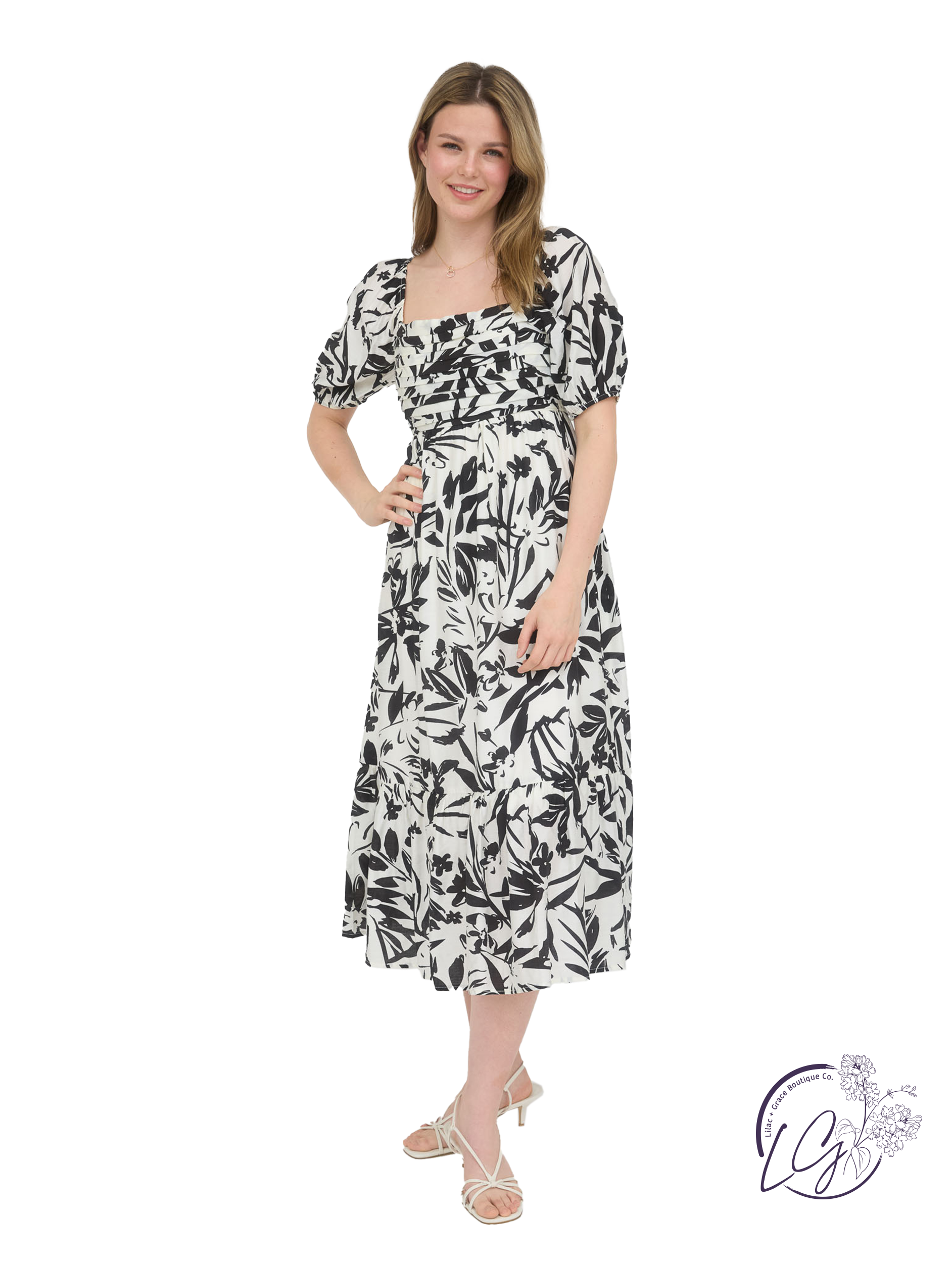 This floral midi dress from Blu Pepper features a soft square neckline, short puff sleeves with elastic bands, and a smocked back for a comfortable, flattering fit. Designed with an inner lining, a ruffled hem, and a woven knit feel, it offers feminine charm with everyday ease.