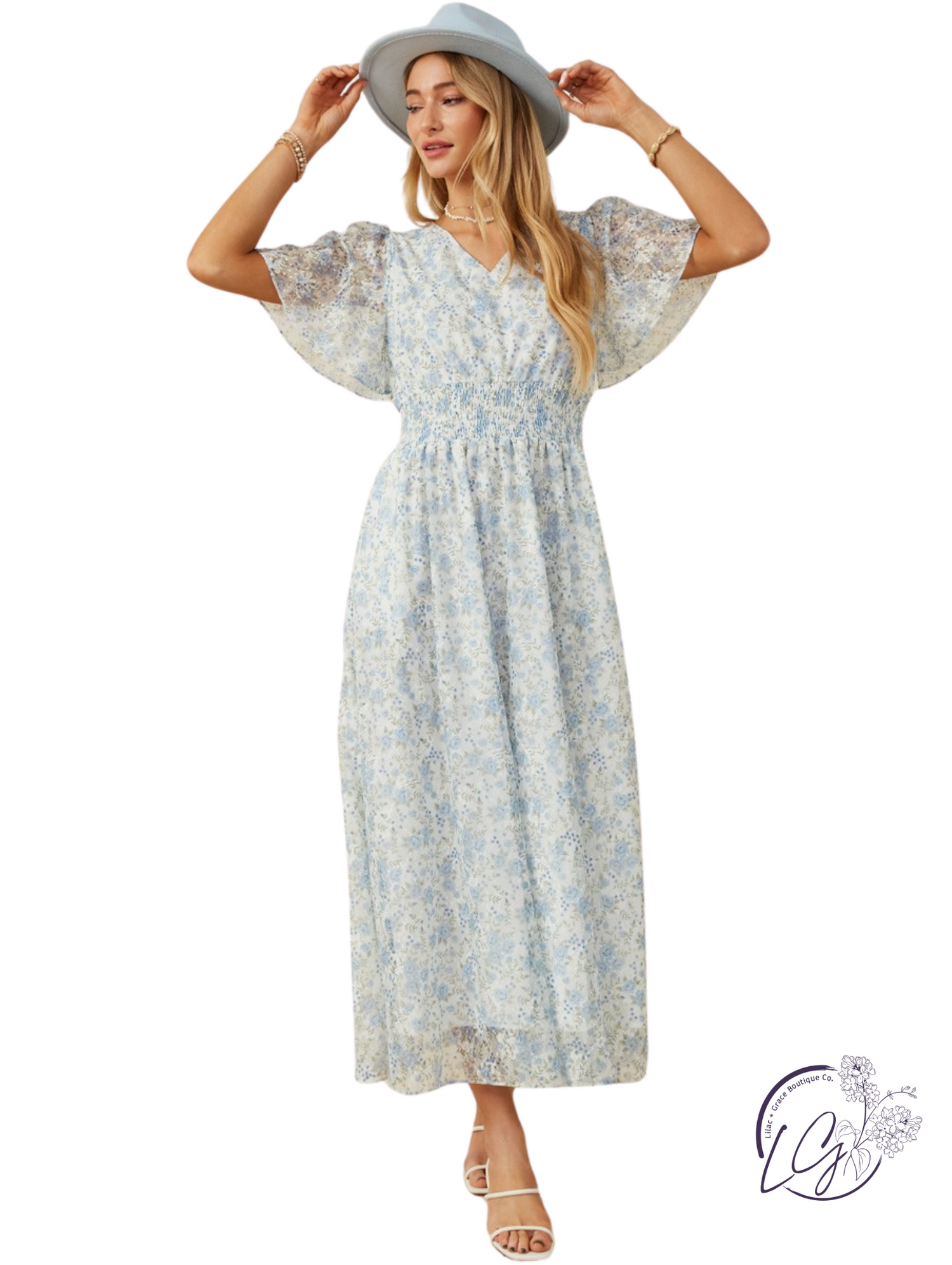 This foiled mesh dress features a vintage-inspired floral print with a subtle shimmer that catches the light. Designed with a flattering V-cut neckline and a smocked waist for shape and comfort, it blends antique elegance with modern ease.