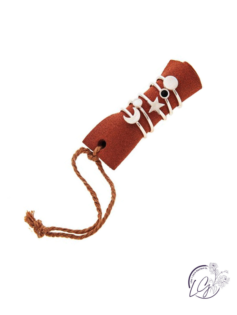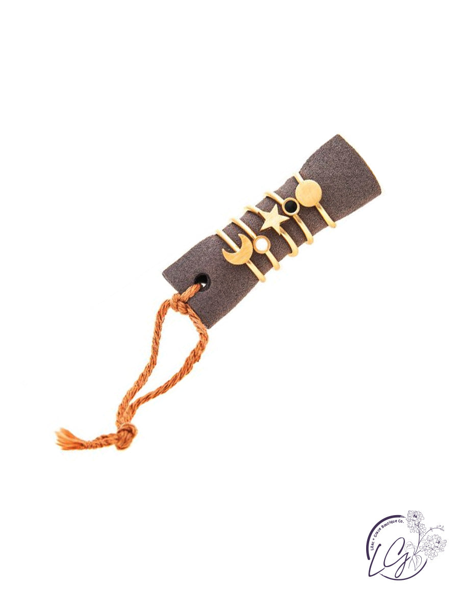 Gold 5 Piece Assorted Black and White Gems Star and Crescent Moon Celestial Theme Adjustable Fashion Ring Set
