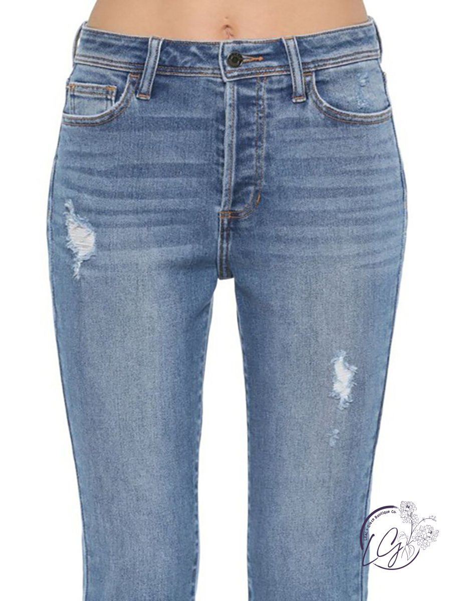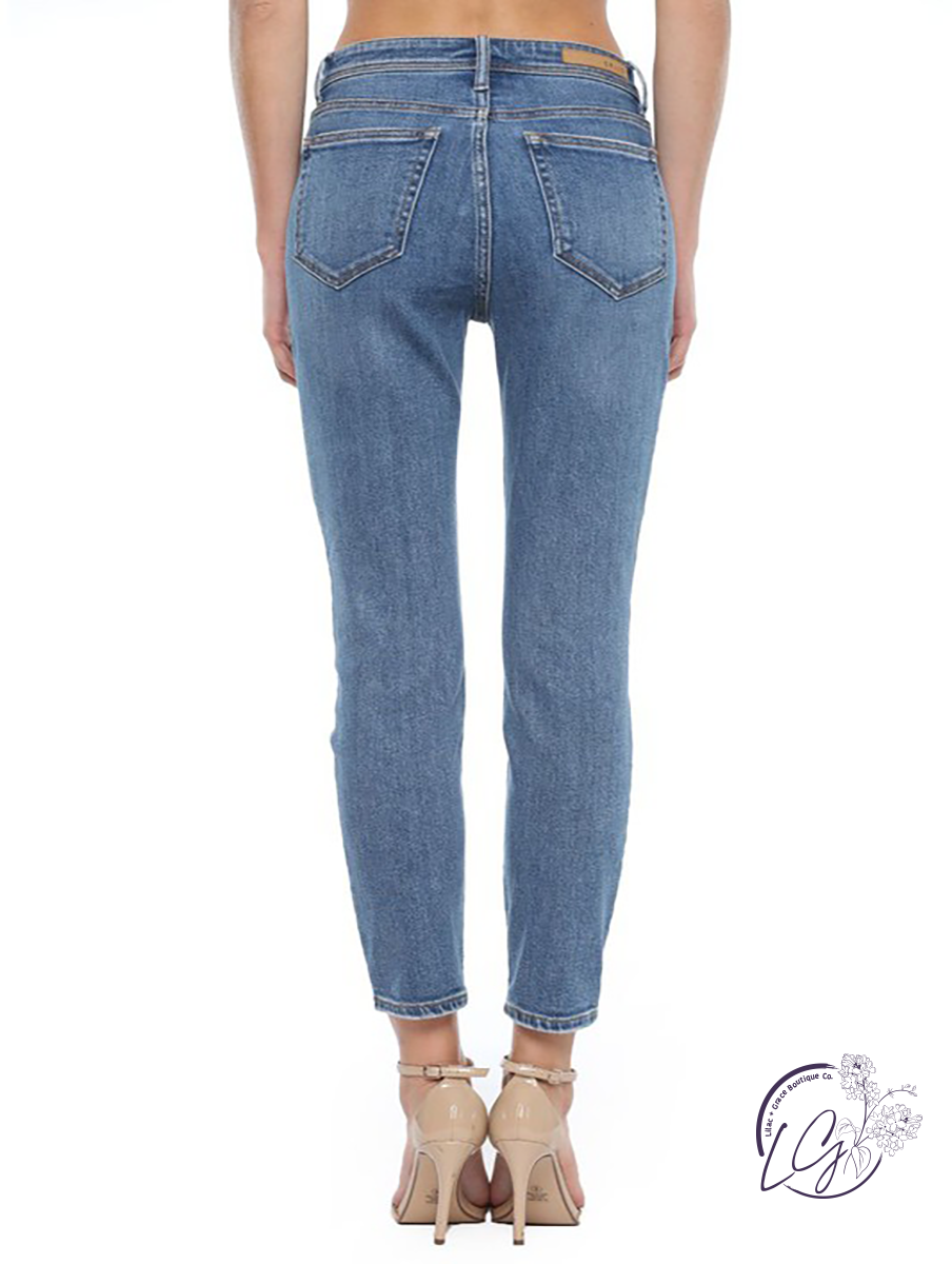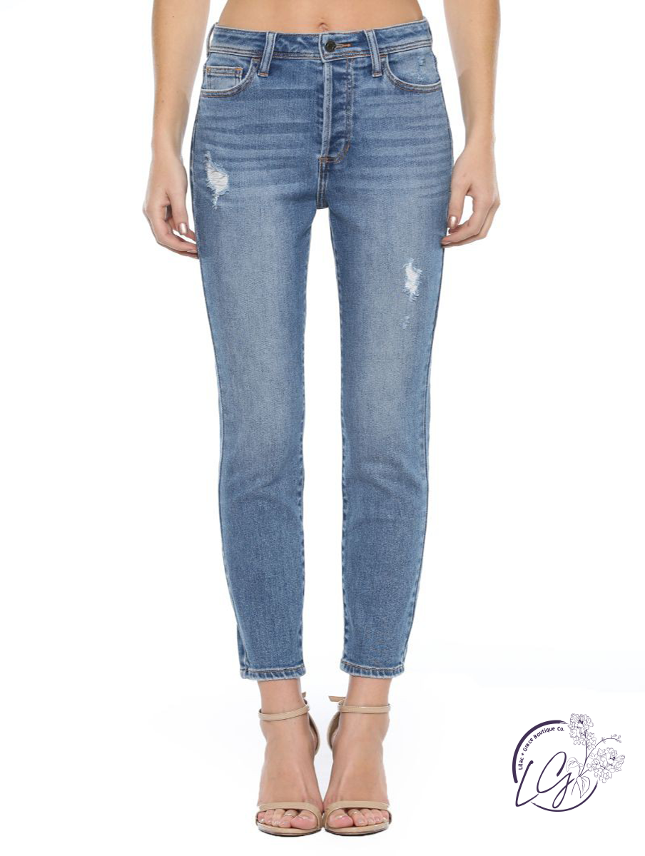 CELLO offers a high-rise fit in the classic medium blue wash mom jeans. Made from substantial stretch, these mom jeans boast a 5 pocket body, belt loops, a 4-button fly closure and a relaxed fit.