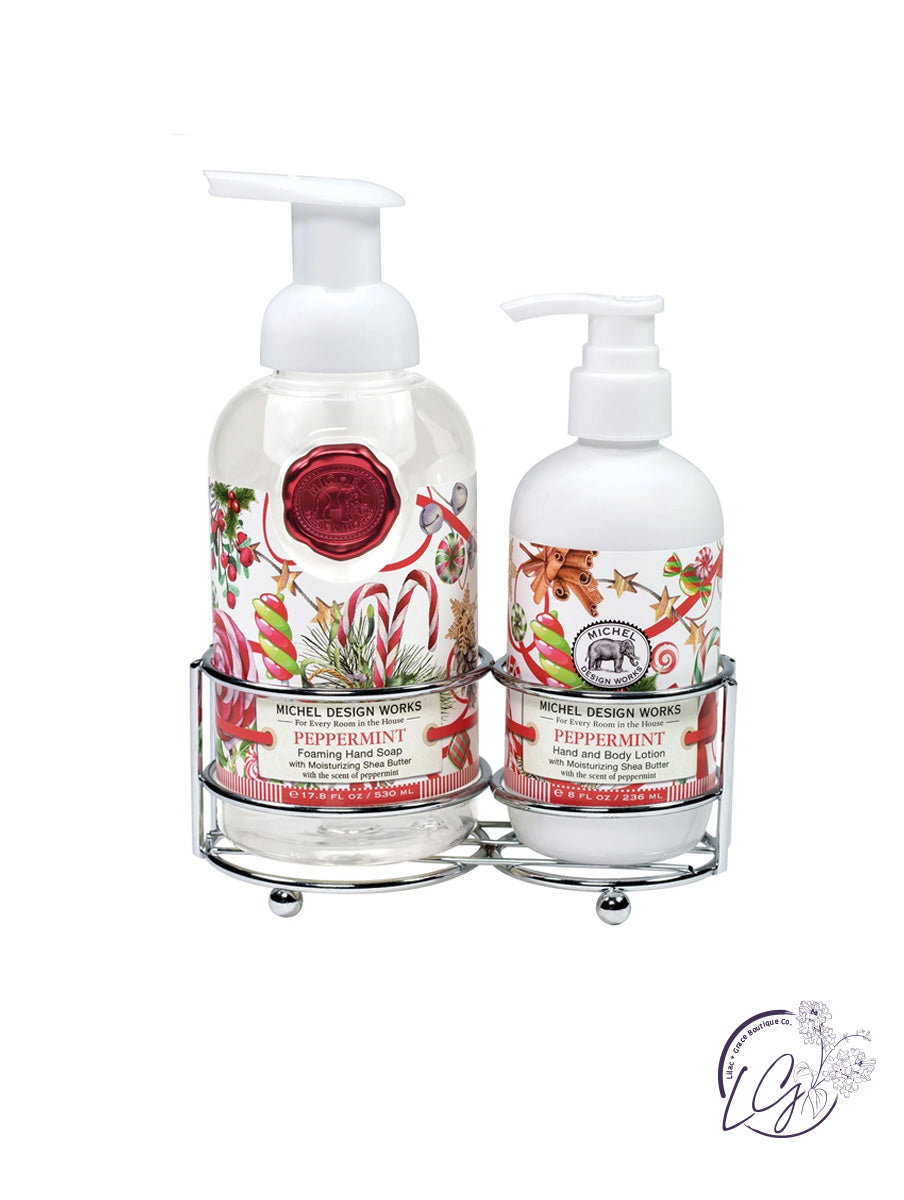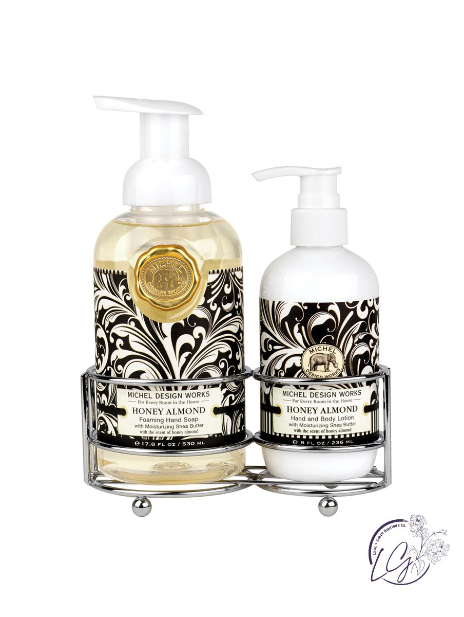Our silver-toned handcare caddy includes our popular foaming hand soap and rich hand and body lotion together in one convenient holder.