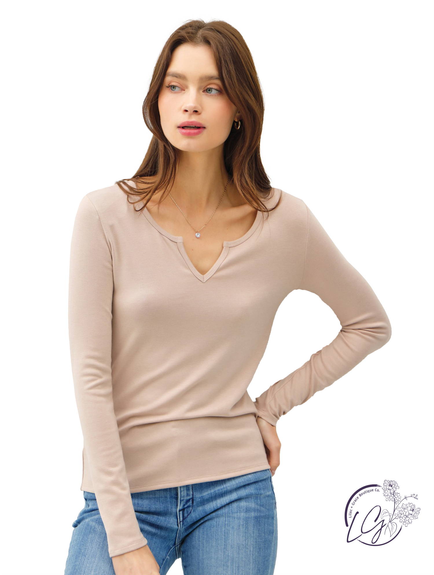 Elevate your wardrobe with the Keep The Faith Knit Tee. Featuring a notched scoop neckline, split neck, and long sleeves, this knit tee is a must-have basic. With a regular slim silhouette and relaxed fit, it's both versatile and flattering. Perfect for transitioning between seasons, the soft and stretchy material ensures comfort all year round.